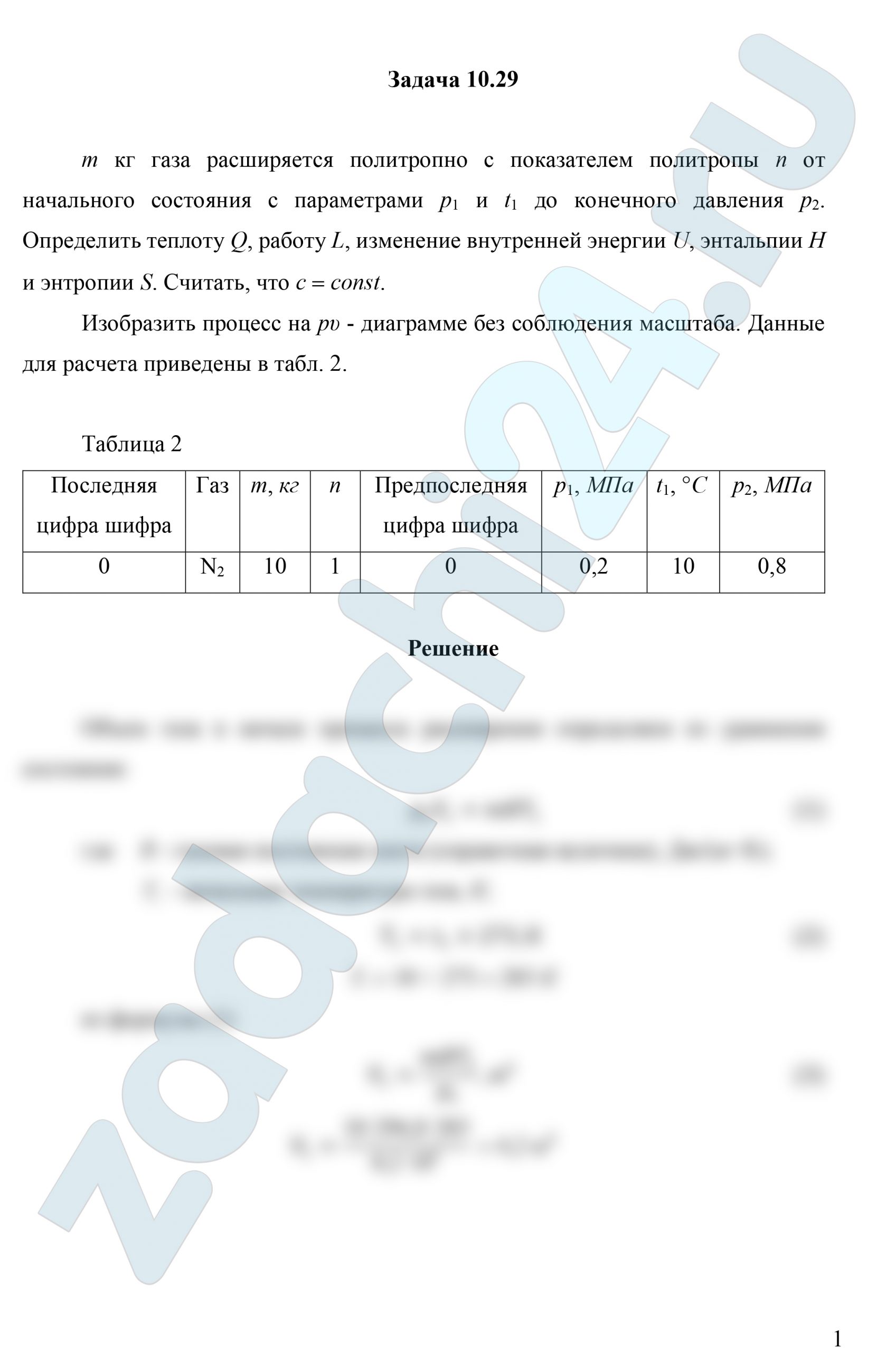 10.29 m кг газа расширяется политропно с показателем политропы n от начального состояния с параметрами p1 и t1 до конечного давления p2. Определить теплоту Q, работу L, изменение внутренней энергии ΔU, энтальпии ΔH и энтропии ΔS. Считать, что c=const.