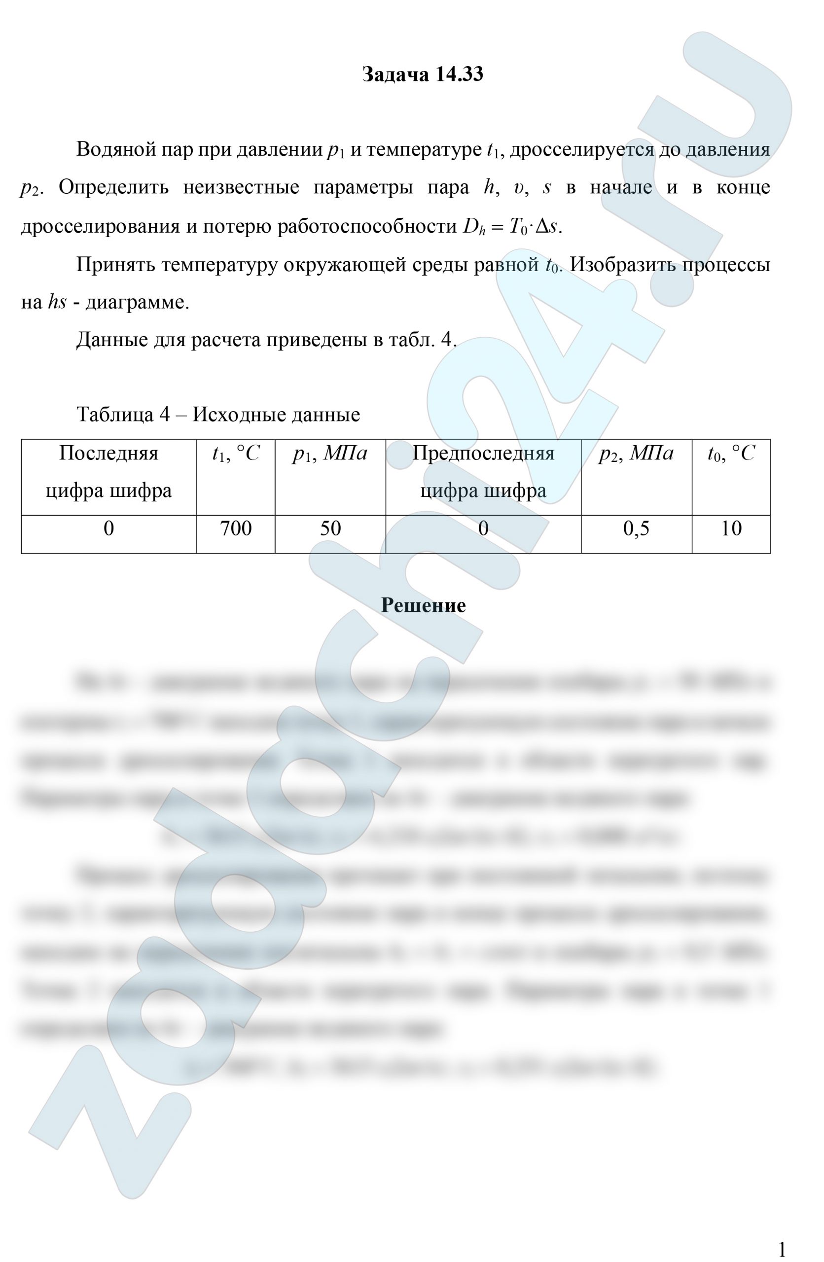 14.33 Водяной пар при давлении р1 и температуре t1, дросселируется до давления p2. Определить неизвестные параметры пара h, υ, s в начале и в конце дросселирования и потерю работоспособности Dh=T0·Δs.