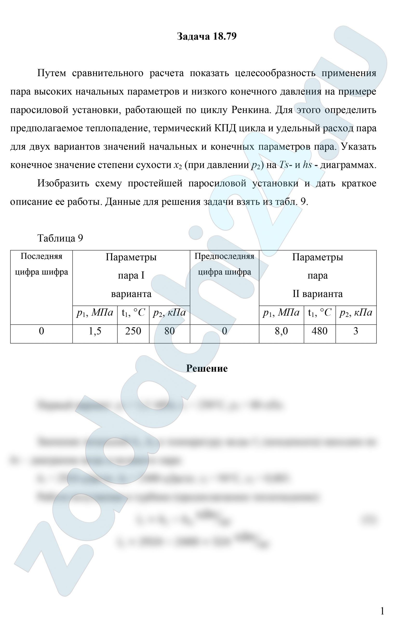 18.79 Путем сравнительного расчета показать целесообразность применения пара высоких начальных параметров и низкого конечного давления на примере паросиловой установки, работающей по циклу Ренкина. Для этого определить предполагаемое теплопадение, термический КПД цикла и удельный расход пара для двух вариантов значений начальных и конечных параметров пара. Указать конечное значение степени сухости х2 (при давлении р2) на Ts- и hs — диаграммах.