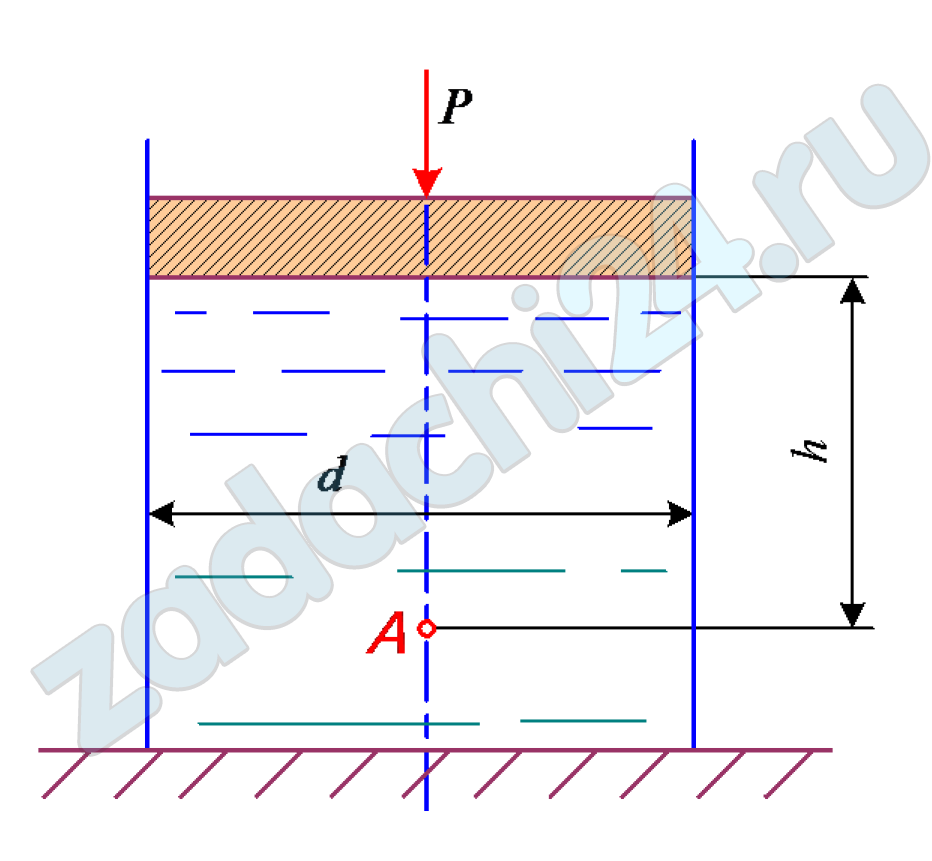 2.482 Определить абсолютное и избыточное гидростатическое давление в точке А на глубине h от поршня, если на поршень диаметром 200 мм воздействует сила Р, атмосферное давление ра = 0,1 МПа.