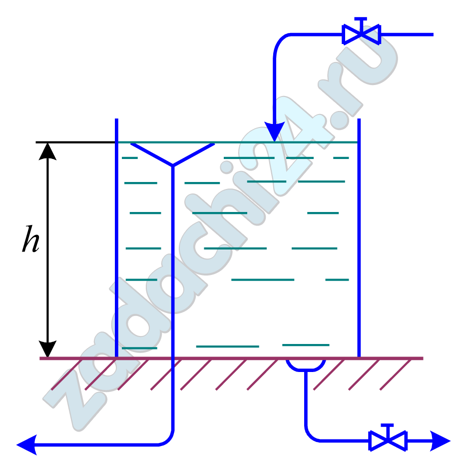 2.483 Определить максимальную глубину в водонапорном баке объемом W, установленном на перекрытии. Дополнительная нагрузка на перекрытие от установки бака с водой не должна превышать p. Масса бака с арматурой m.