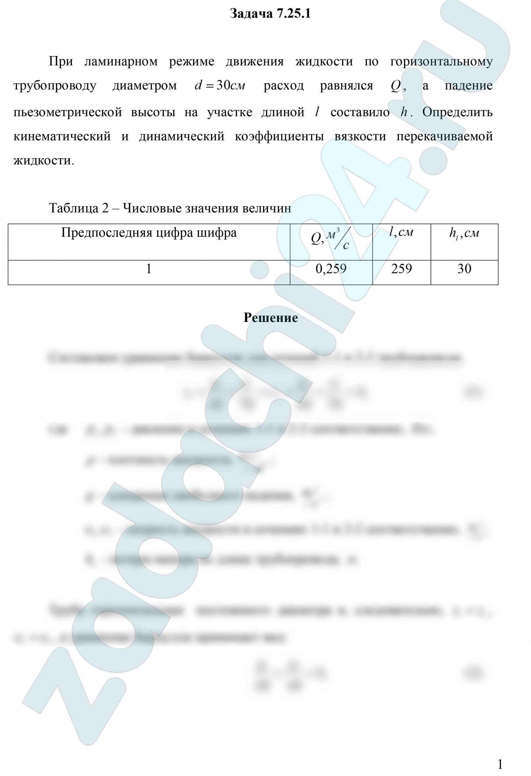 7.25 При ламинарном режиме движения жидкости по горизонтальному трубопроводу диаметром d=30 см расход равнялся Q, а падение пьезометрической высоты на участке трубопровода длиной l составило hl. Определить кинематический и динамический коэффициенты вязкости перекачиваемой жидкости.