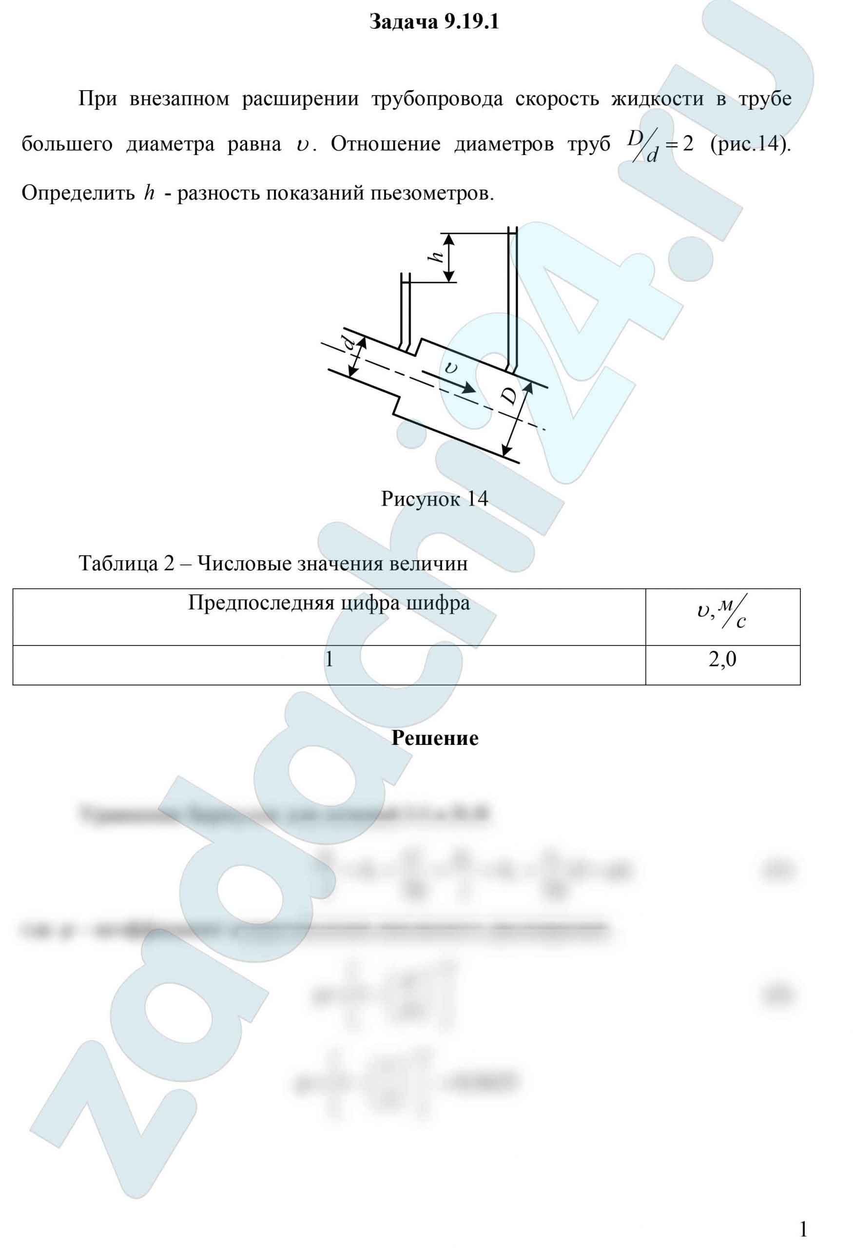 9.19 При внезапном расширении трубопровода скорость жидкости в трубе большего диаметра равна υ. Отношение диаметров труб D/d=2 (рис.14). Определить h — разность показаний пьезометров.