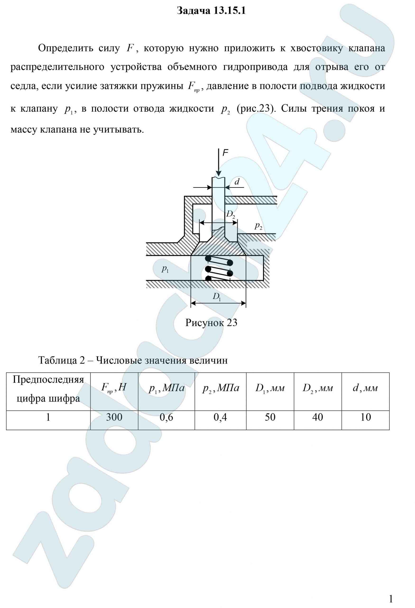 13.15 Определить силу F, которую нужно приложить к хвостовику клапана распределительного устройства объемного гидропривода для отрыва его от седла, если усилие затяжки пружины Fпр, давление в полости подвода жидкости к клапану р1, в полости отвода жидкости р2 (рис.23). Силы трения покоя и массу клапана не учитывать.