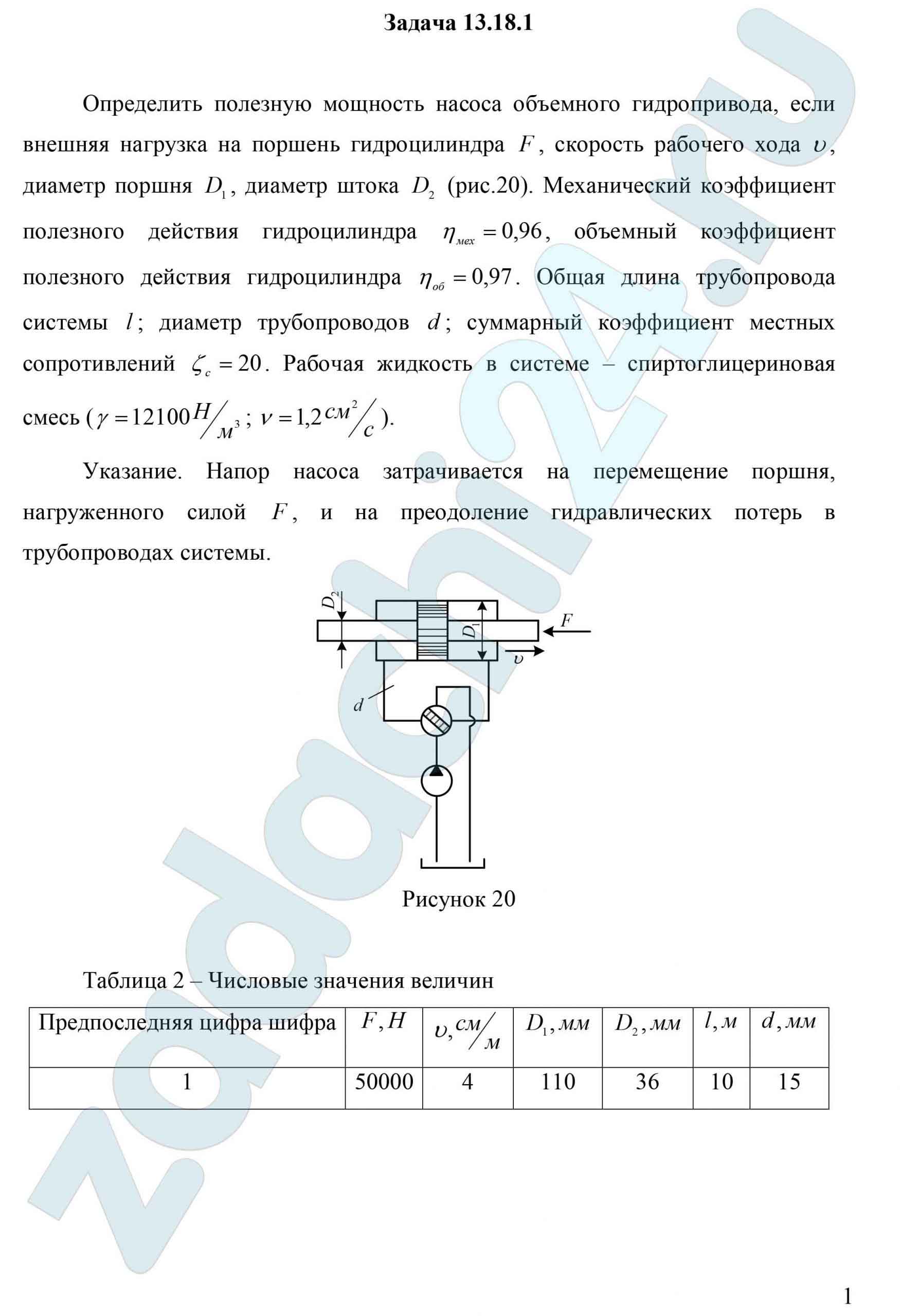 13.18 Определить полезную мощность насоса объемного гидропривода, если внешняя нагрузка на поршень гидроцилиндра F, скорость рабочего хода υ, диаметр поршня D1, диаметр штока D2 (рис.20). Механический коэффициент полезного действия гидроцилиндра ηмех=0,96, объемный коэффициент полезного действия гидроцилиндра ηоб=0,97. Общая длина трубопровода системы l; диаметр трубопроводов d; суммарный коэффициент местных сопротивлений ζc=20. Рабочая жидкость в системе – спиртоглицериновая смесь (γ=12100 H/м³; ν=1,2 см²/c).