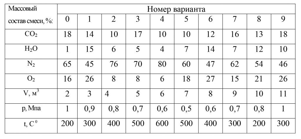 3.85 Смесь идеальных газов заданного массового состава занимает объем V при постоянном абсолютном давлении p и температуре t. Требуется определить газовую постоянную смеси, среднюю молекулярную массу, массу смеси, объемный состав смеси, а также среднюю мольную, объемную и массовую теплоемкости смеси (при p=const) для интервала температур 0-t.