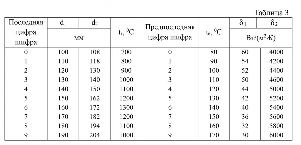 Определить коэффициент теплопередачи k от газа к воде, тепловой поток q и температуры поверхностей трубы. Данные, необходимые для решения задачи, выбрать из табл. Определить также температуру внешней поверхности трубы и q, если она покрылась слоем накипи толщиной δ=2 мм, теплопроводность которой λ =0,8 Вт/(м·К) (при α2=const). Данные для решения задачи выбрать из таблицы 3.