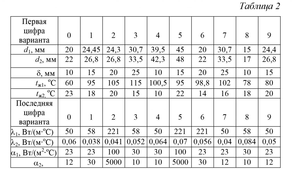 По трубопроводу с размерами d2/d1, где d1 — внутренний диаметр трубы, а d2 — наружный диаметр, течет горячая вода с температурой tж1. Температура окружающей среды tж2. Снаружи труба покрыта слоем изоляционного материала толщиной δ с коэффициентом теплопроводности λ2, коэффициентом теплопроводности материала трубы λ1. Средние коэффициенты теплоотдачи с внутренней поверхности трубы и внешней изоляционного материала соответственно равны α1, α2. Определить количество теплоты, отдаваемой единицей длины трубы в окружающее пространство, а также температуры на внутренней и внешней поверхностях трубы.