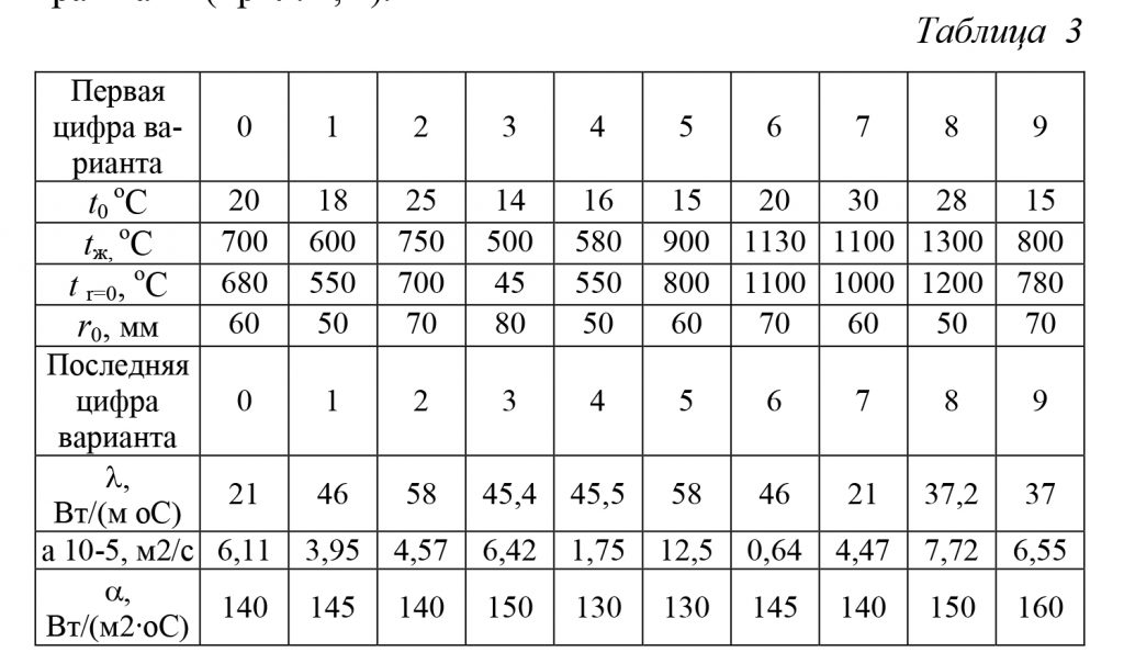 Длинный стальной вал диаметром d = 2r0, который имел температуру t0, °C, был помещен в печь с температурой tж, ºС. Определить время τ, необходимое для нагрева вала, если нагрев считается законченным, когда температура на оси вала станет равной tr=0, ºC. Определить также температуру на поверхности вала tr=ro в конце нагрева.