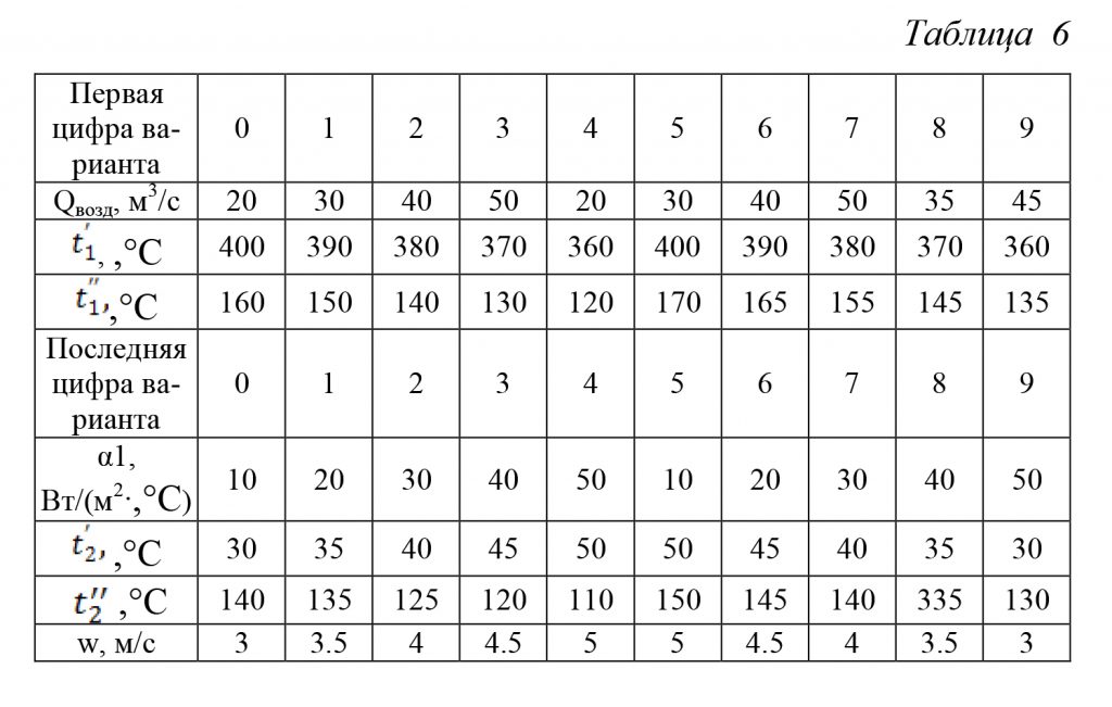 Определить поверхность нагрева стального рекуперативного воздушного теплообменника (толщина стенок δст = 3 мм) при прямоточной и противоточной схемах движения теплоносителей, если объемный расход воздуха при нормальных условиях Qвозд, средний коэффициент теплоотдачи от воздуха к поверхности нагрева α1, от поверхности нагрева к воде α2, Вт/(м⸱°С), начальные и конечные температуры воздуха и воды соответственно равны t’1, t»1, t’2, t»2. Определить также расход воды Qвод, через теплообменник. Изобразить график изменения температур теплоносителей для обеих схем при различных соотношениях их условных эквивалентов.