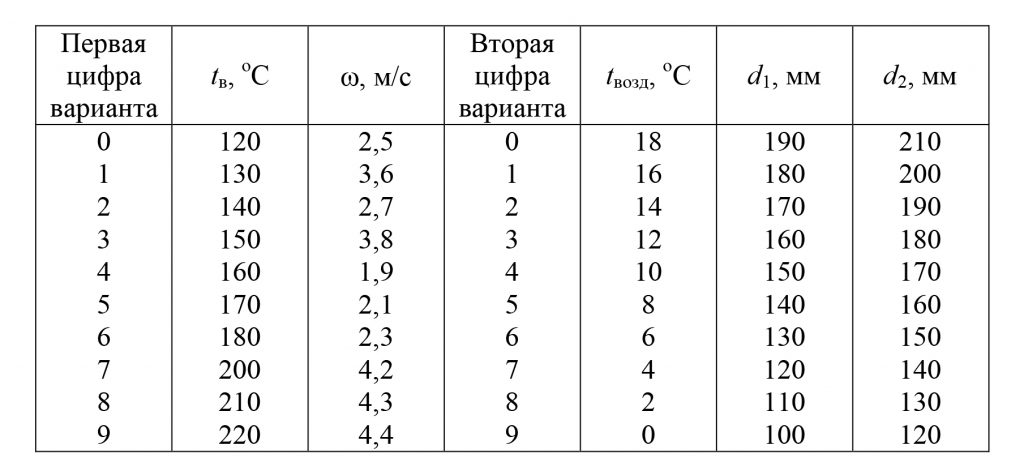 23.62 По горизонтально расположенной стальной трубе (λ=40-50 Вт/(м·К) со скоростью ω, м/c течет вода, имеющая температуру tв, ºС. Снаружи труба охлаждается окружающим воздухом, температура которого tвозд, ºС, при условии свободной конвекции.