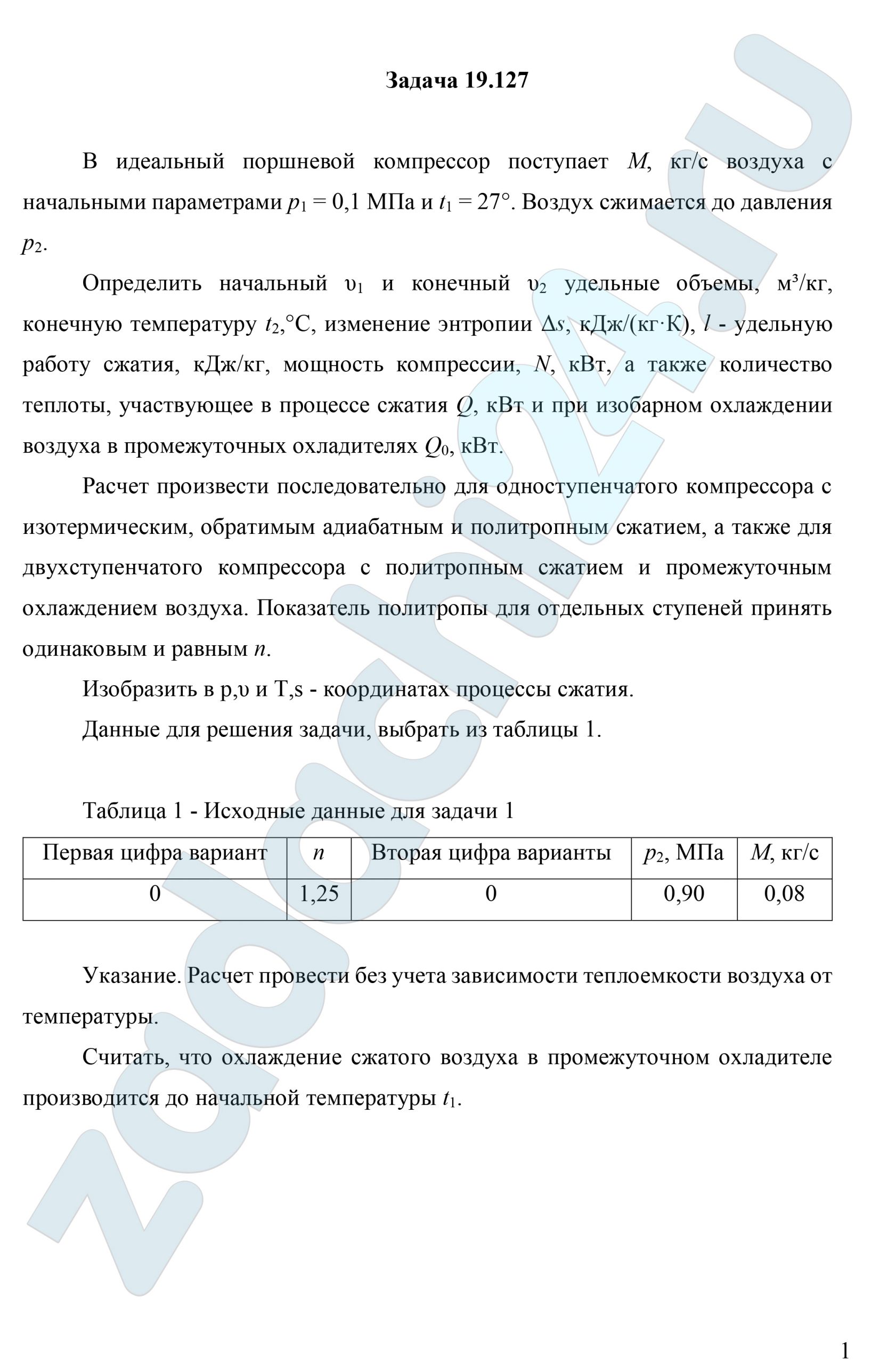19.127 В идеальный поршневой компрессор поступает М, кг/c воздуха с начальными параметрами р1=0,1 МПа и t1=27 ºC. Воздух сжимается до давления р2.