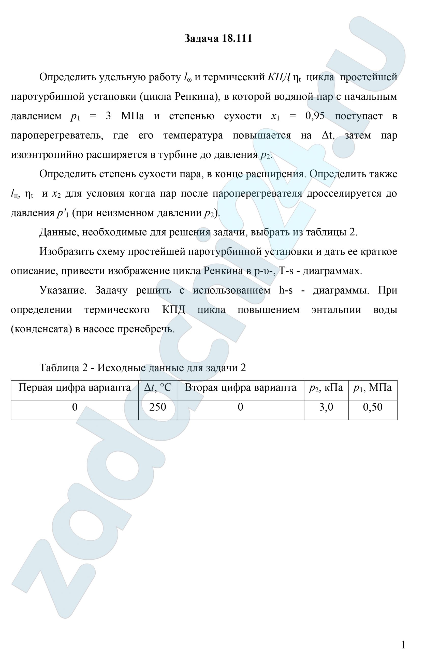 18.111 Определить удельную работу lω и термический КПД ηt цикла простейшей паротурбинной установки (цикла Ренкина), в которой водяной пар с начальным давлением р1=3 МПа и степенью сухости х1=0,95 поступает в пароперегреватель, где его температура повышается на Δt, затем пар изоэнтропийно расширяется в турбине до давления p2.