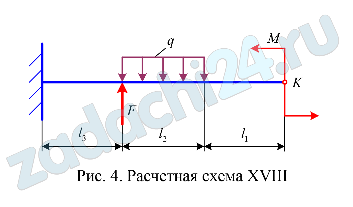 Исходные данные принять по табл.8.Расчет статически определимой консольной балки на прочность и жесткость Для заданной консольной балки требуется (табл. 9): а) построить эпюры внутренних силовых факторов Q и М в балке; б) проверить на прочность по нормальным напряжениям сечение из задачи 2; в) рассчитать угол поворота и прогиб в точке К методом начальных параметров. Исходные данные принять по табл.8.
