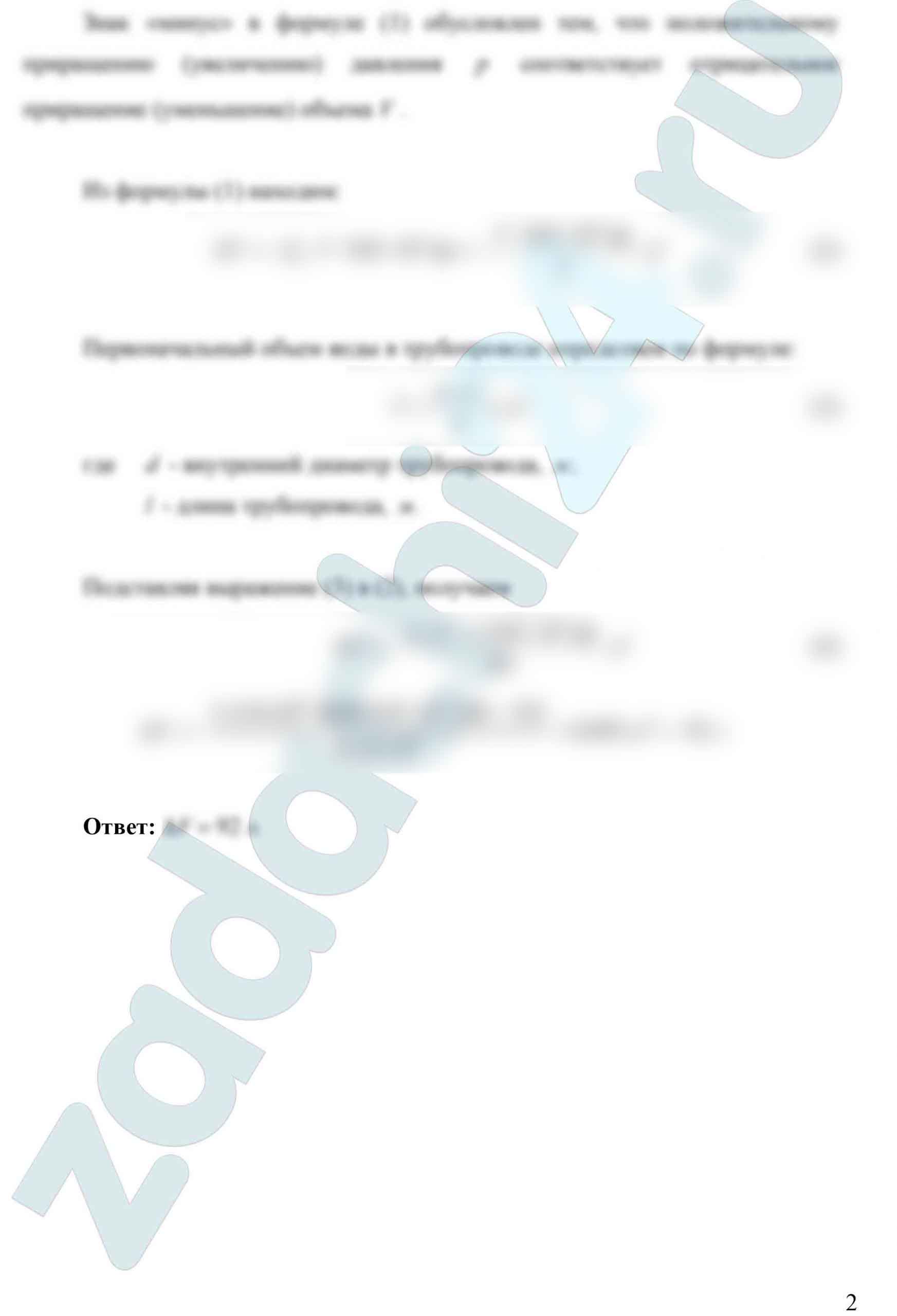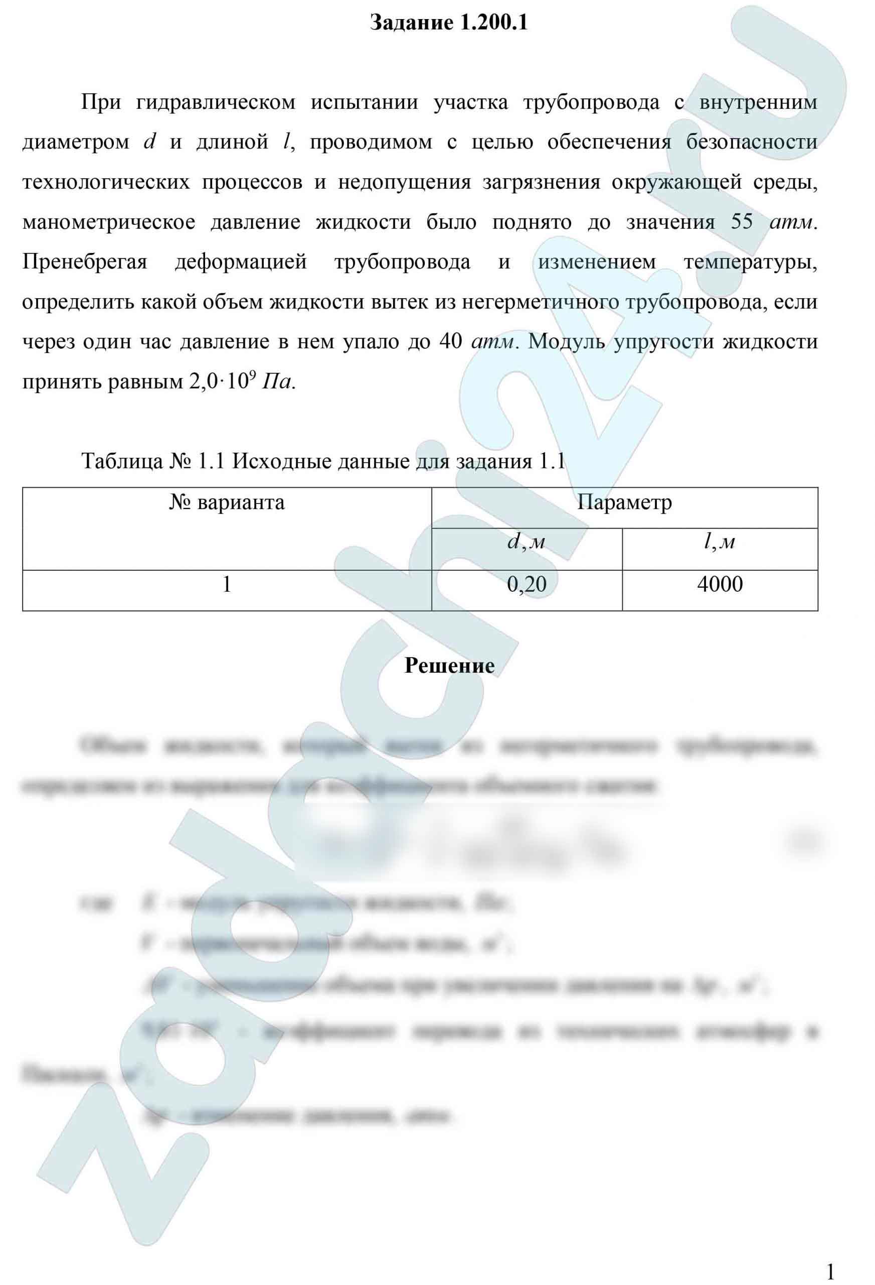 1.200 При гидравлическом испытании участка трубопровода с внутренним диаметром d и длиной l, проводимом с целью обеспечения безопасности технологических процессов и недопущения загрязнения окружающей среды, манометрическое давление жидкости было поднято до значения 55 атм. Пренебрегая деформацией трубопровода и изменением температуры, определить какой объем жидкости вытек из негерметичного трубопровода, если через один час давление в нем упало до 40 атм. Модуль упругости жидкости принять равным 2,0·109 Па.