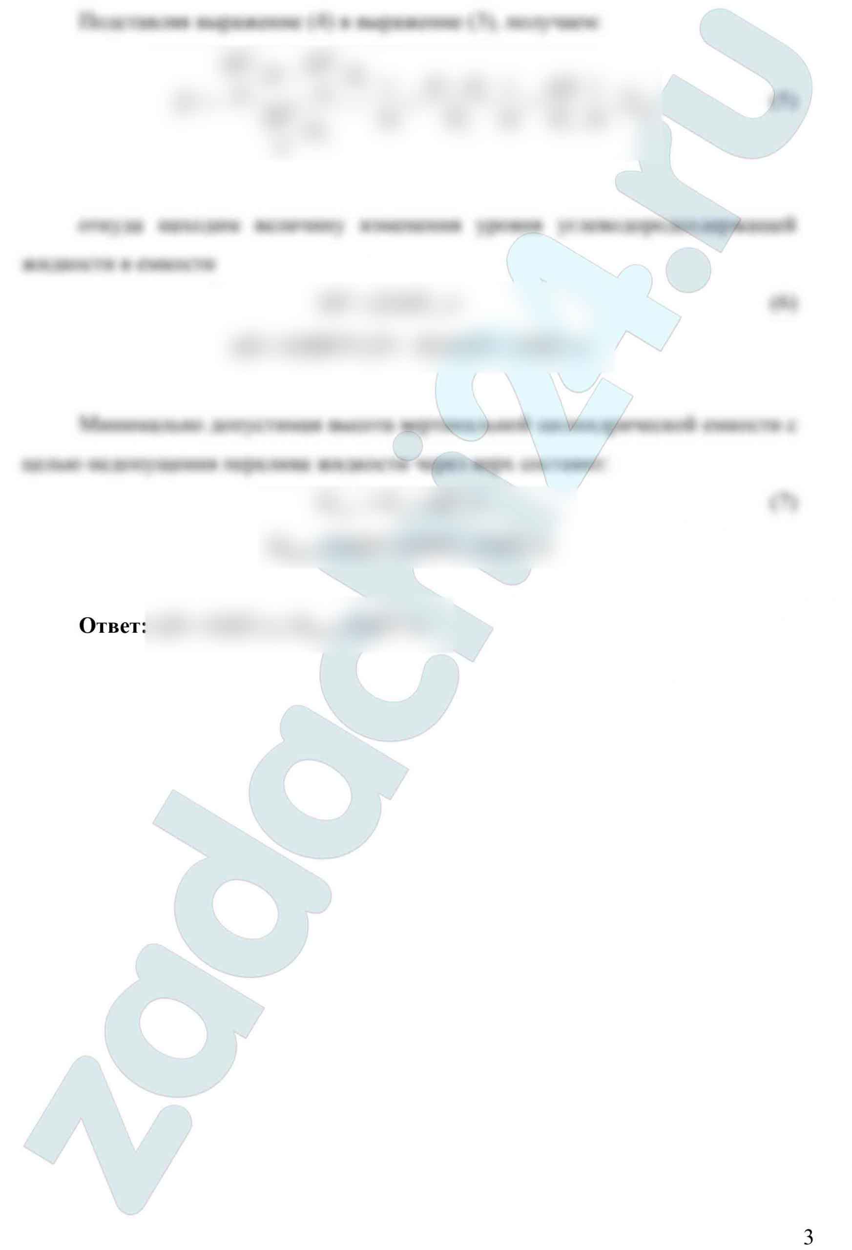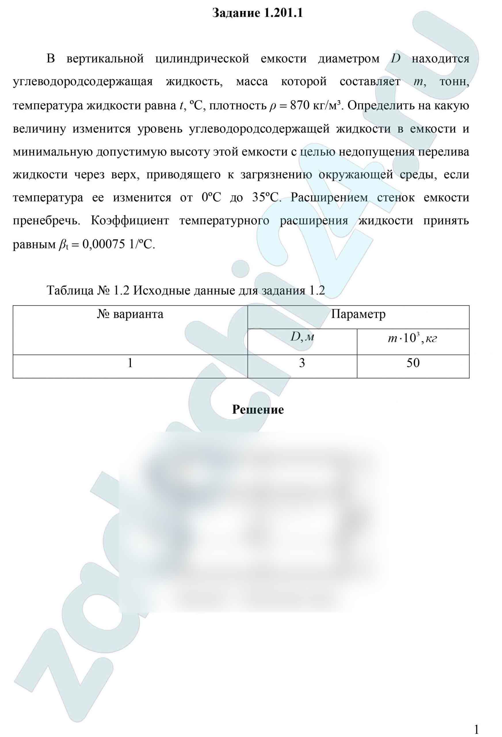 1.201 В вертикальной цилиндрической емкости диаметром D находится углеводородсодержащая жидкость, масса которой составляет m, тонн, температура жидкости равна t, ºС, плотность ρ = 870 кг/м³. Определить на какую величину изменится уровень углеводородсодержащей жидкости в емкости и минимальную допустимую высоту этой емкости с целью недопущения перелива жидкости через верх, приводящего к загрязнению окружающей среды, если температура ее изменится от 0ºС до 35ºС. Расширением стенок емкости пренебречь. Коэффициент температурного расширения жидкости принять равным βt = 0,00075 1/ºС.