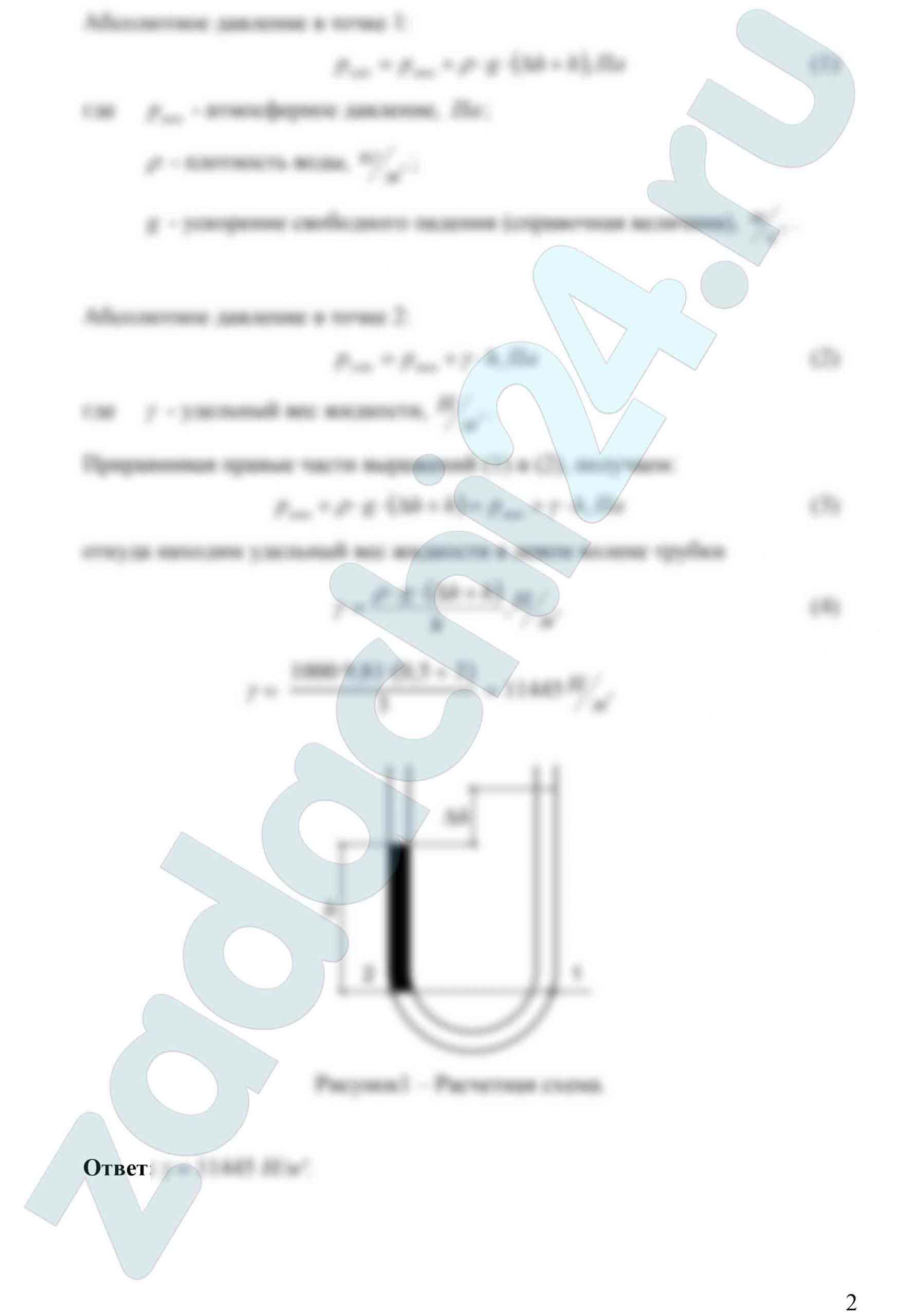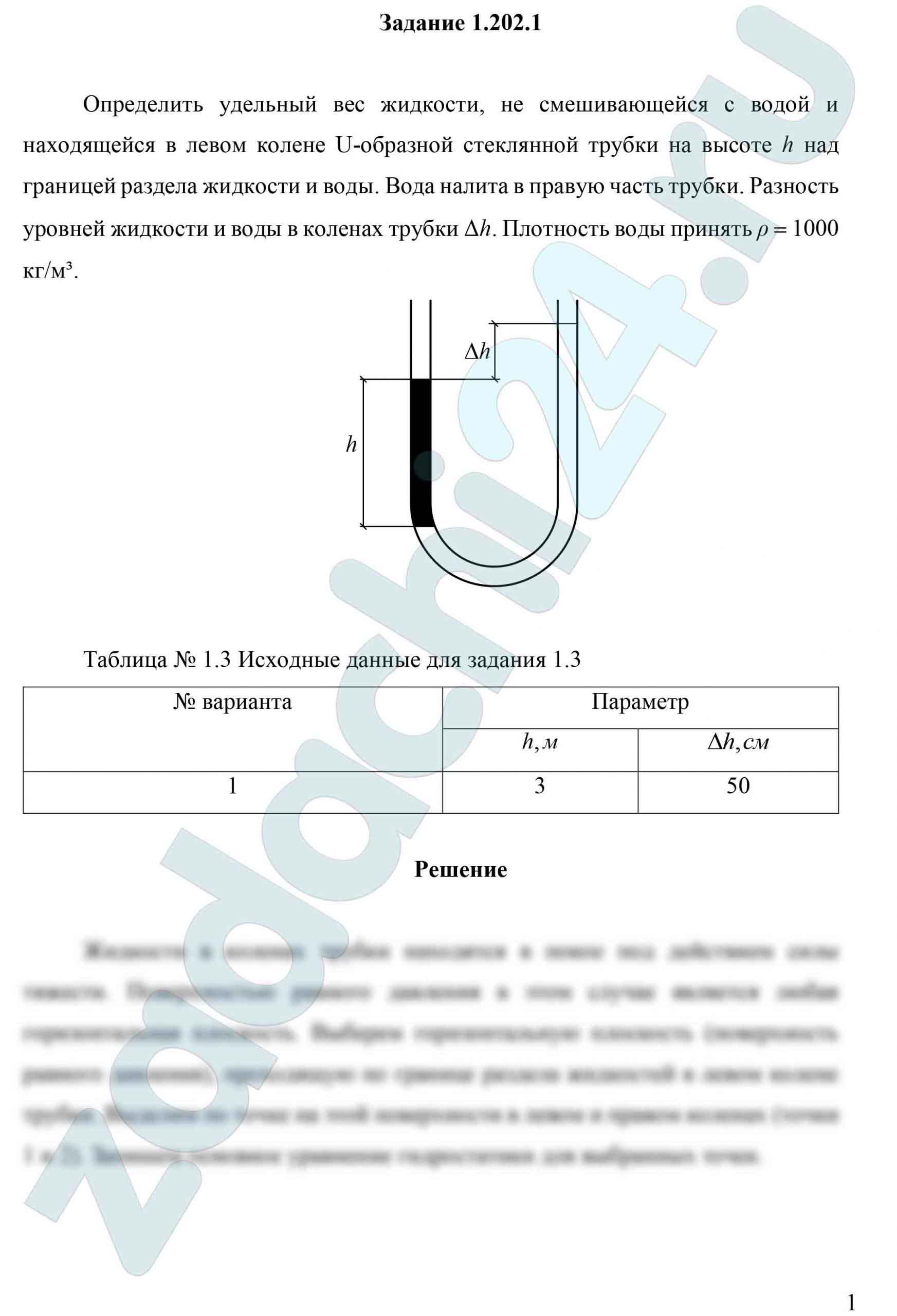 1.202 Определить удельный вес жидкости, не смешивающейся с водой и находящейся в левом колене U-образной стеклянной трубки на высоте h над границей раздела жидкости и воды. Вода налита в правую часть трубки. Разность уровней жидкости и воды в коленах трубки Δh. Плотность воды принять ρ = 1000 кг/м³.Определить удельный вес жидкости, не смешивающейся с водой и находящейся в левом колене U-образной стеклянной трубки на высоте h над границей раздела жидкости и воды. Вода налита в правую часть трубки. Разность уровней жидкости и воды в коленах трубки Δh. Плотность воды принять ρ = 1000 кг/м³.