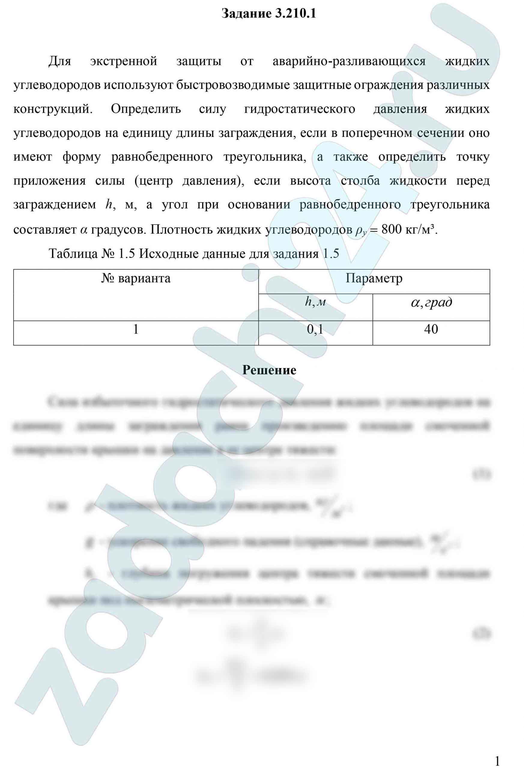 3.210 Для экстренной защиты от аварийно-разливающихся жидких углеводородов используют быстровозводимые защитные ограждения различных конструкций. Определить силу гидростатического давления жидких углеводородов на единицу длины заграждения, если в поперечном сечении оно имеют форму равнобедренного треугольника, а также определить точку приложения силы (центр давления), если высота столба жидкости перед заграждением h, м, а угол при основании равнобедренного треугольника составляет α градусов. Плотность жидких углеводородов ρу = 800 кг/м³.