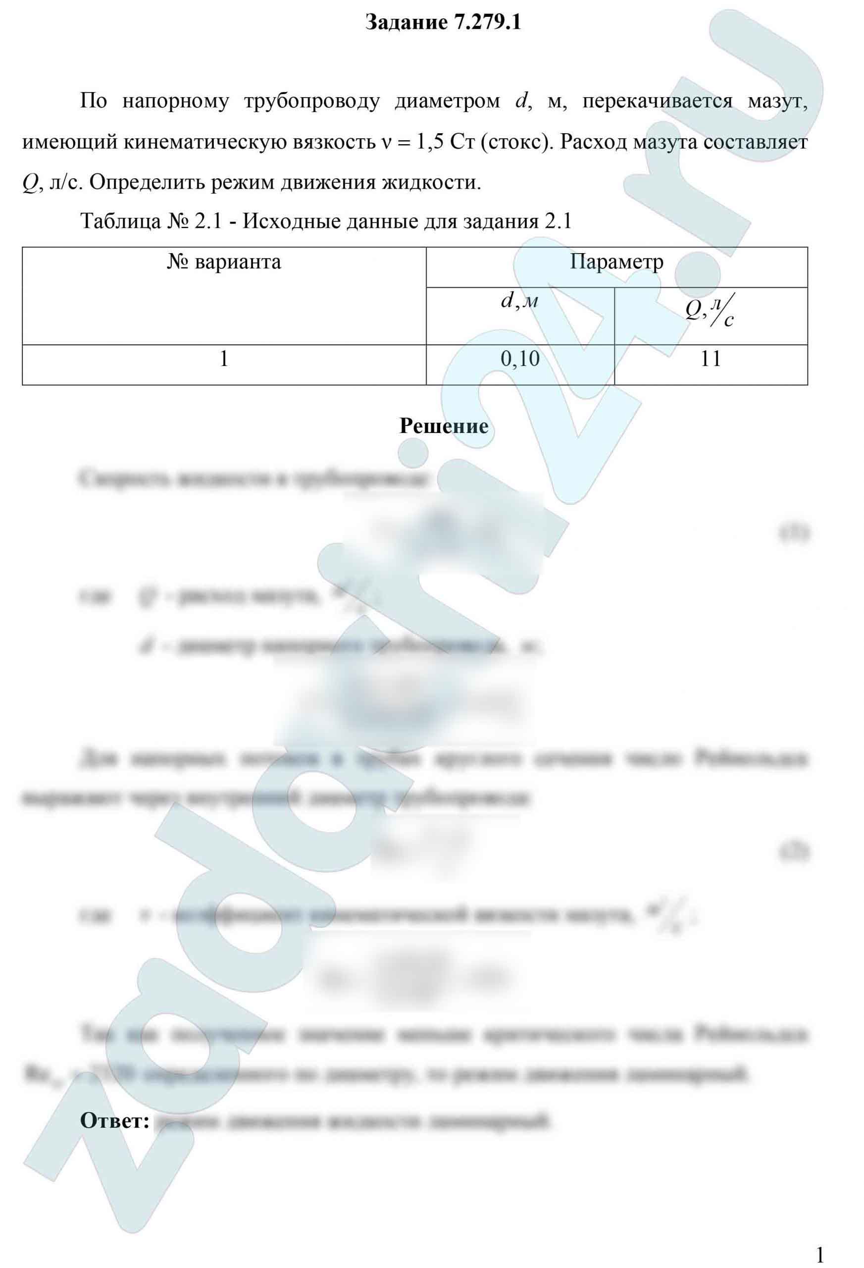7.279 По напорному трубопроводу диаметром d, м, перекачивается мазут, имеющий кинематическую вязкость ν = 1,5 Ст (стокс). Расход мазута составляет Q, л/с. Определить режим движения жидкости.