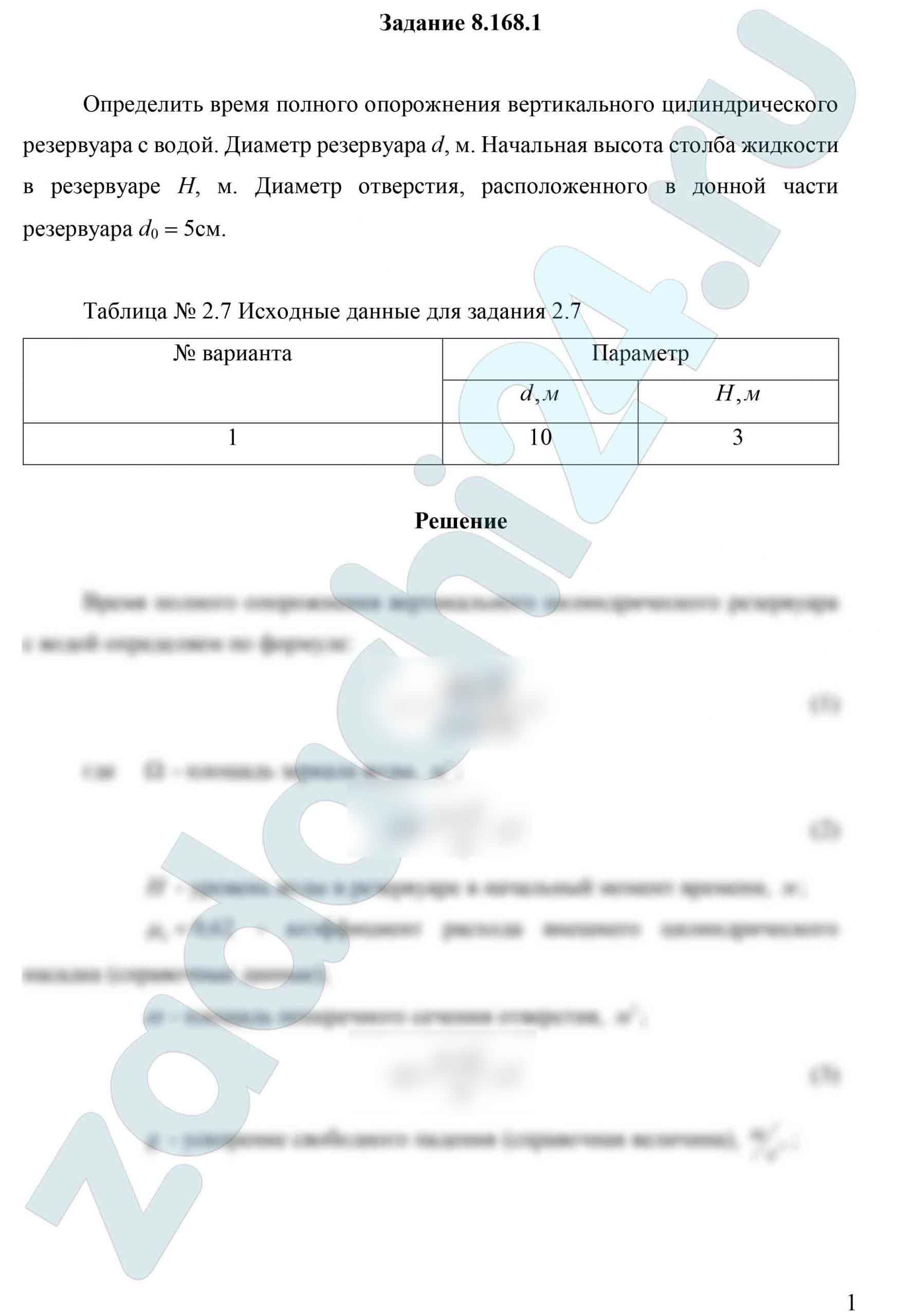 8.168 Определить время полного опорожнения вертикального цилиндрического резервуара с водой. Диаметр резервуара d, м. Начальная высота столба жидкости в резервуаре H, м. Диаметр отверстия, расположенного в донной части резервуара d0 = 5см.