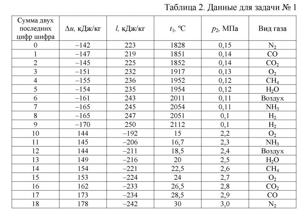 10.69 В процессе изменения состояния 1 кг газа внутренняя энергия его увеличивается (или уменьшается) на Δu. При этом над газом совершается работа (или газ совершает работу), равная l. Начальная температура газа t1, конечное давление p2 (табл. 2).