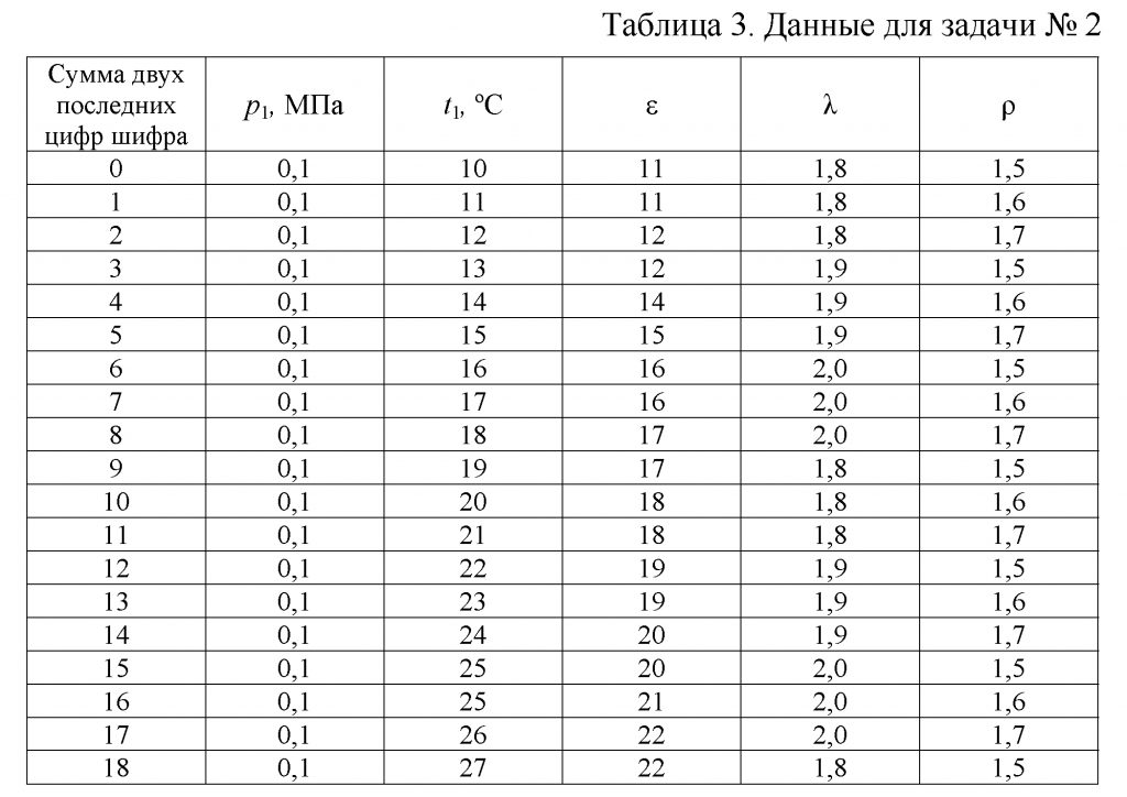16.172 Определить параметры рабочего тела в характерных точках идеального цикла поршневого двигателя внутреннего сгорания с изохорно — изобарным подводом теплоты (смешанный цикл), если известны давление р1 и температура t1 рабочего тела в начале сжатия. Степень сжатия ε, степень повышения давления λ, степень предварительного расширения ρ заданы (табл. 3).