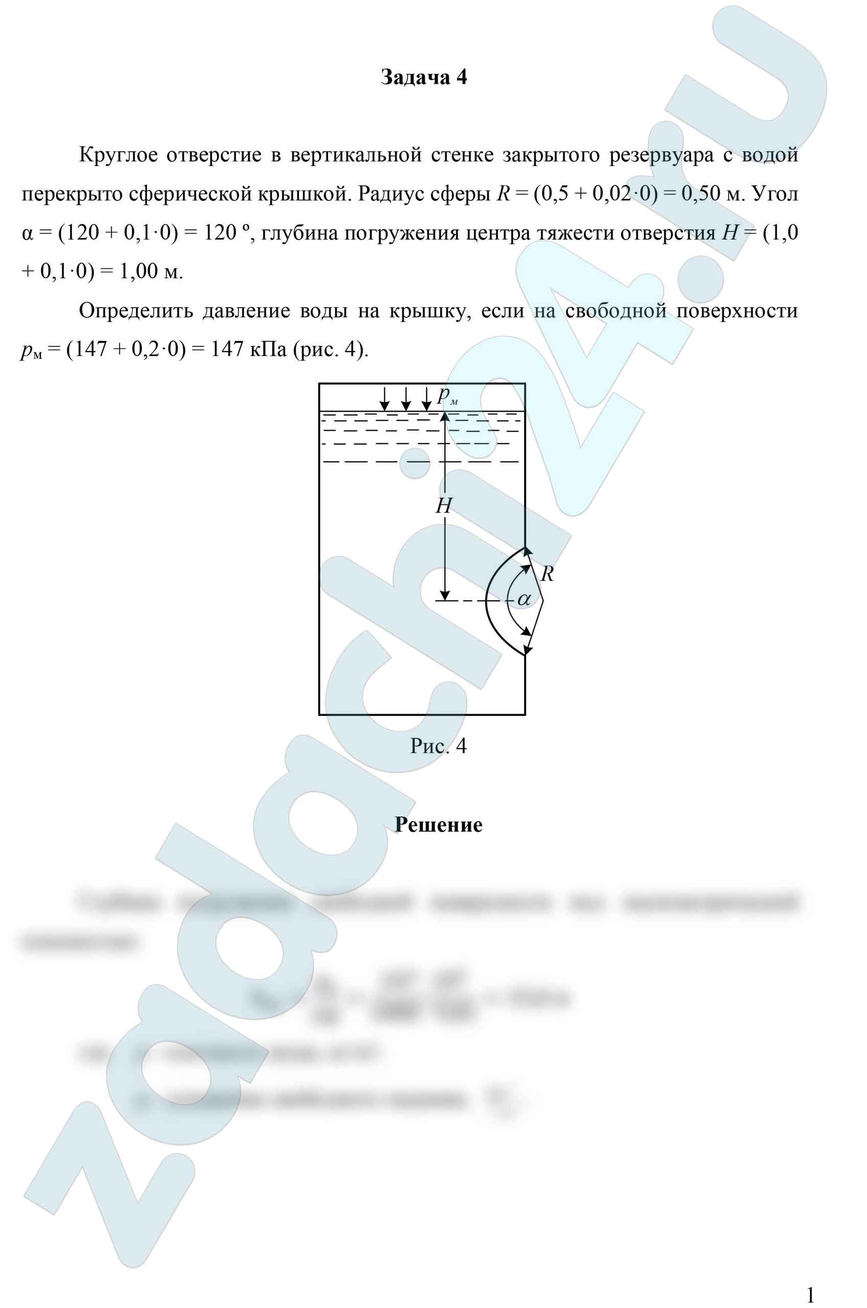 Скачать файлы4.221 Круглое отверстие в вертикальной стенке закрытого резервуара с водой перекрыто сферической крышкой. Радиус сферы R = (0,5 + 0,02·y) м. угол α = (120 + 0,1·z)º, глубина погружения центра тяжести отверстия H = (1,0 + 0,1·y) м.