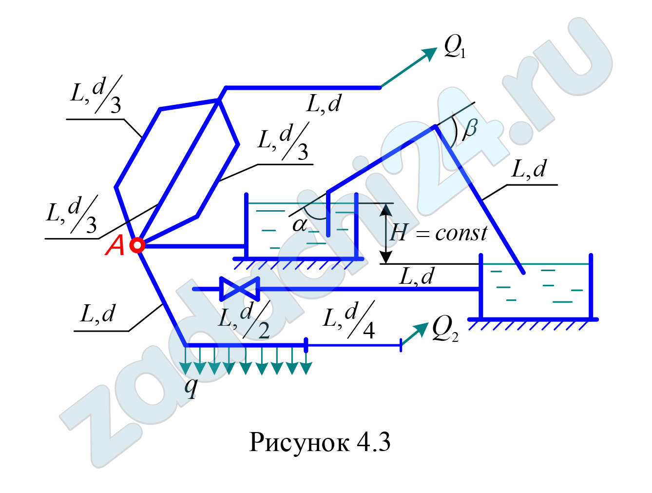 11.149 От пункта А проложена водопроводная сеть: с последовательным и параллельным соединениями стальных, бывших в эксплуатации, трубопроводов, к двум водоемам на разных отметках и постоянной разницей уровней Н. Вода подается из одного водоема в другой посредством сифона с углами поворота α и β, выполненного из стального трубопровода диаметром d. От нижнего водоема отходит стальной трубопровод длиной L и диаметром d, заканчивающийся задвижкой. На последнем участке последовательного соединения трубопроводов имеется равномерно распределенный путевой объемный расход q и объемный расход в конце трубопровода Q2.
