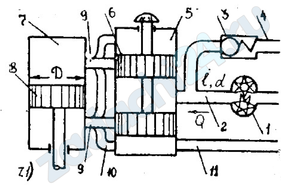 13.77 Гидравлическая система загрузчика сеялок автомобильного ЗСА-40 содержит шестеренный насос 1 с подачей Q, подключенный к нагнетательному трубопроводу 2 длиной l диаметром d, установленный на сливном трубопроводе 3 предохранительный клапан 4; распределитель 5, в полости которого размещен золотник 6, и силовой цилиндр 7 с поршнем 8 диаметром D (усилие которого N), соединенный с распределителем через трубопроводы 9, и сливной трубопровод 10, полости распределителя сообщены между собой посредством трубопровода 11. В качестве рабочей жидкости используется автотракторное масло удельным весом γ и кинематической вязкостью ν. Определить давление р на выходе насоса.