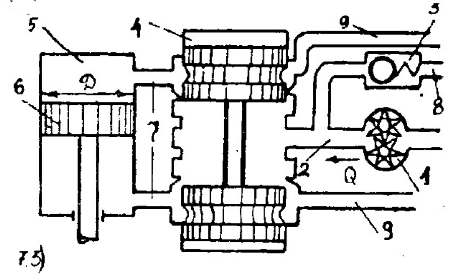 13.114 Гидравлическая система рулевого управления трактора К-700 состоит из насоса 1 с подачей Q = 137×10-6 м³/с давление на выходе которого р = 5,6 МПа, соединенного нагнетательным трубопроводом 2 длиной l = 10,0 м и диаметром d = 12,5 мм с предохранительным клапаном 3 (установленным на сливном трубопроводе 4), распределителем 5 с размещенным в нем золотником 6 и силовым цилиндром 7 с поршнем 8 диаметром D = 60 мм. Распределитель соединен с силовым цилиндром посредством трубопроводов 9, причем, полости распределителя сообщены с помощью трубопроводов 10, и сливным трубопроводом 11. В качестве рабочей жидкости используется автотракторное масло кинематической вязкостью ν = 0,20 см²/с и удельным весом γ = 8,62 кН/м³. Местные потери напора от потерь на трение по длине нагнетательного трубопровода 20%.