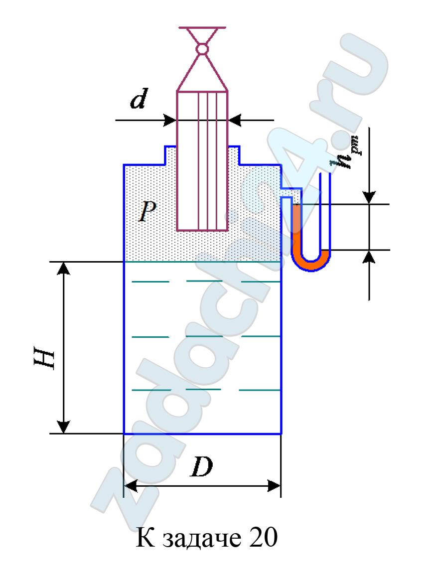 2.479 Цилиндрический резервуар диаметром D и массой m = 20 кг, наполненный маслом (относительная плотность δм = 0,925) до уровня Н, висит без трения на плунжере диаметром d. Определить абсолютное давление р воздуха в резервуаре, обеспечивающее равновесие резервуара. Определить также показание ртутного вакуумметра hpт.