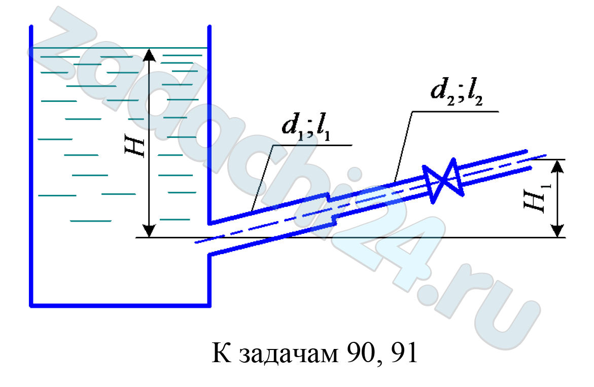 10.339 Из открытого резервуара по трубопроводу (d1, l1 и d2, l2) происходит истечение воды в атмосферу при постоянном напоре H = 4,0 м. Коэффициент сопротивления крана ζк, шероховатость стенок трубы Δ = 0,50 мм.