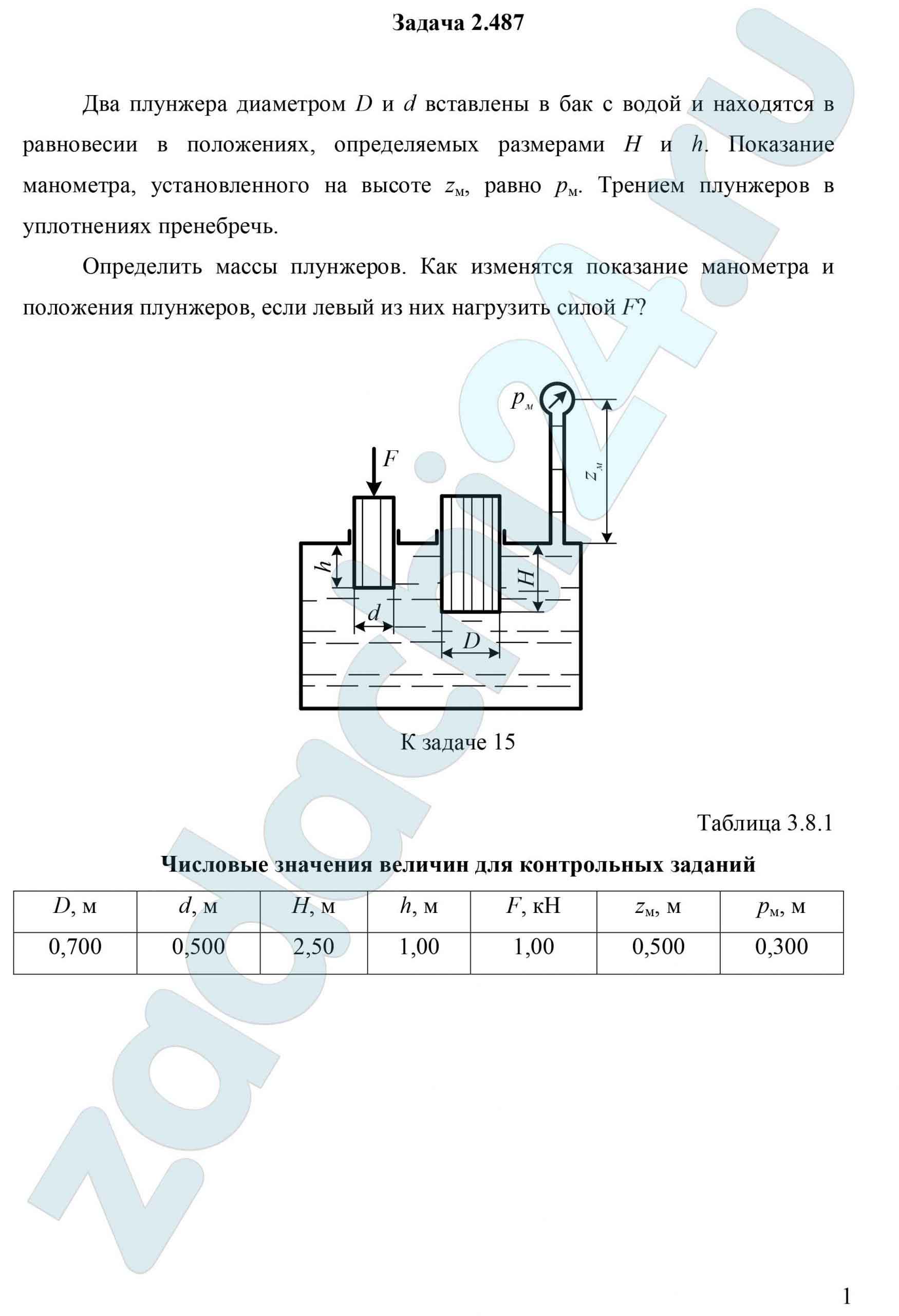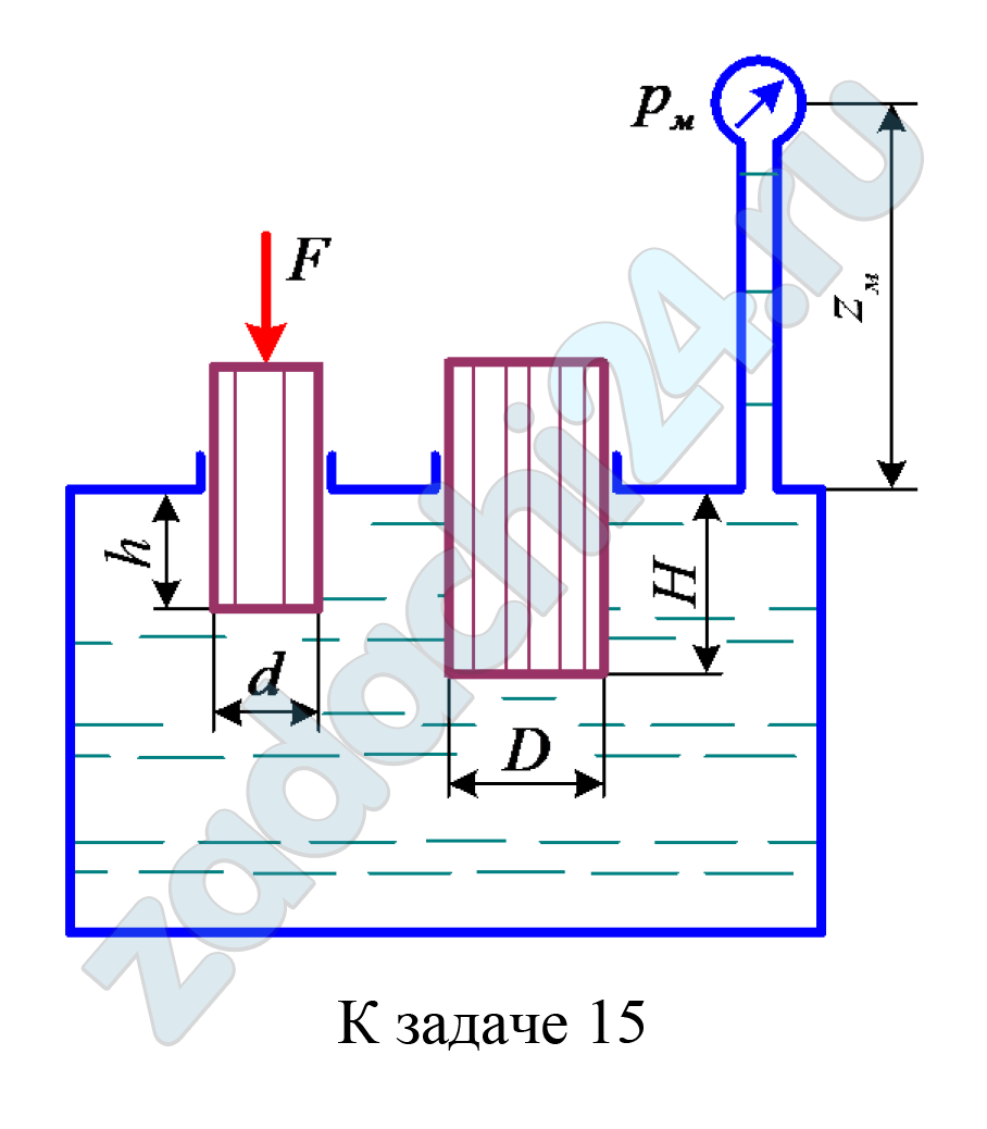 2.487 Два плунжера диаметром D и d вставлены в бак с водой и находятся в равновесии в положениях, определяемых размерами H и h. Показание манометра, установленного на высоте zм, равно рм. Трением плунжеров в уплотнениях пренебречь.