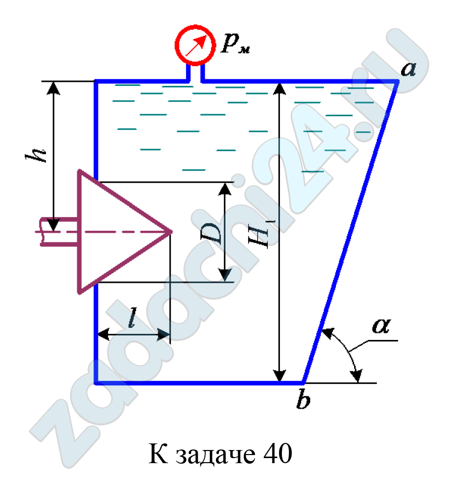 4.228 Резервуар длиной L = 3,20 м и высотой H1 в вертикальной стенке на глубине h = 1,2 м имеет отверстие диаметром D, закрытое коническим клапаном высотой l = 240 мм. Резервуар полностью заполнен маслом (ρ = 840 кг/м³). Показание манометра, установленного на крыше резервуара, составляет pм.