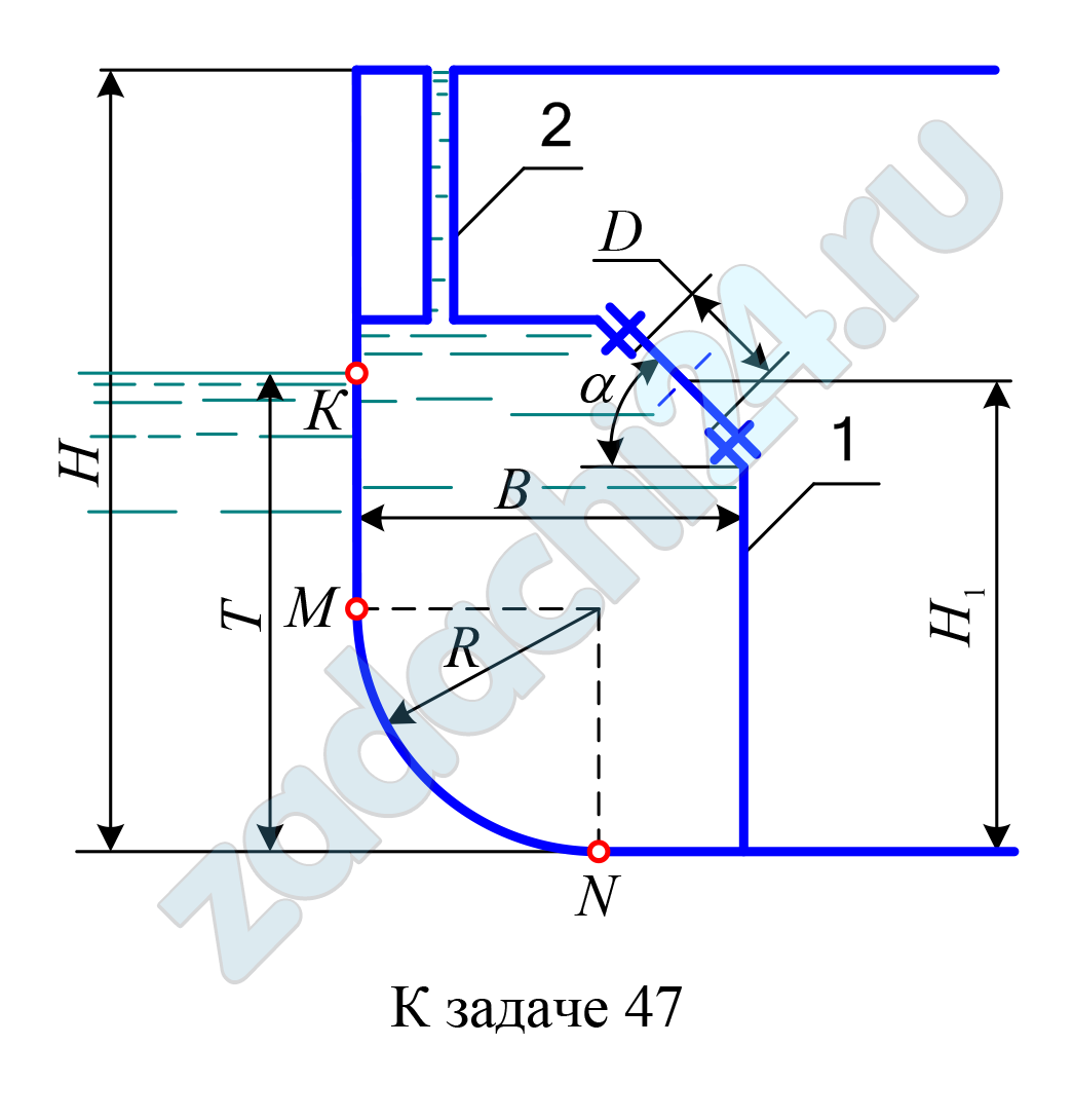 4.229 Бортовая топливная цистерна 1 заполняется топливом (ρт = 780 кг/м³) через приемную трубку 2, выходящую на палубу судна (Н = 5,5 м). В наклонной стенке цистерны имеется отверстие, закрытое плоской крышкой. Центр крышки расположен на расстоянии H1 от днища. Ширина цистерны В = 1,5 м, радиус скулы R, осадка судна Т = 3,0 м.