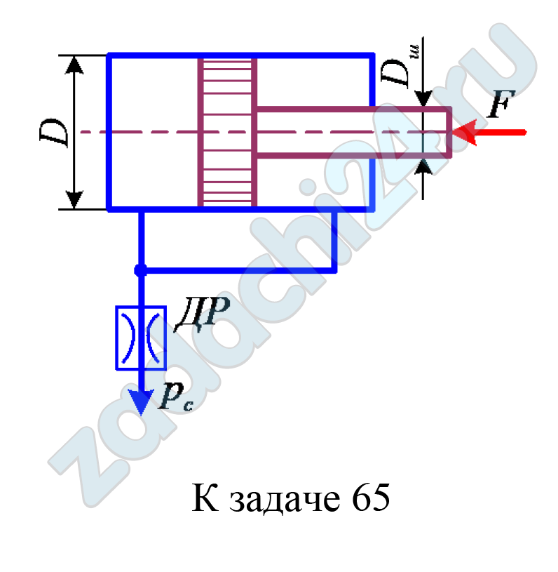 8.226 Определить скорость движения поршня диаметром D под действием силы F на штоке диаметром Dш. Проходное сечение дросселя ДР S0 = 2,0 мм², его коэффициент расхода μ = 0,75, избыточное давление слива pс = pм. Давление в штоковой части цилиндра принять равным нулю, потерями давления от гидроцилиндра до дросселя пренебречь. Рабочая жидкость – масло (ρ = 900 кг/м³).