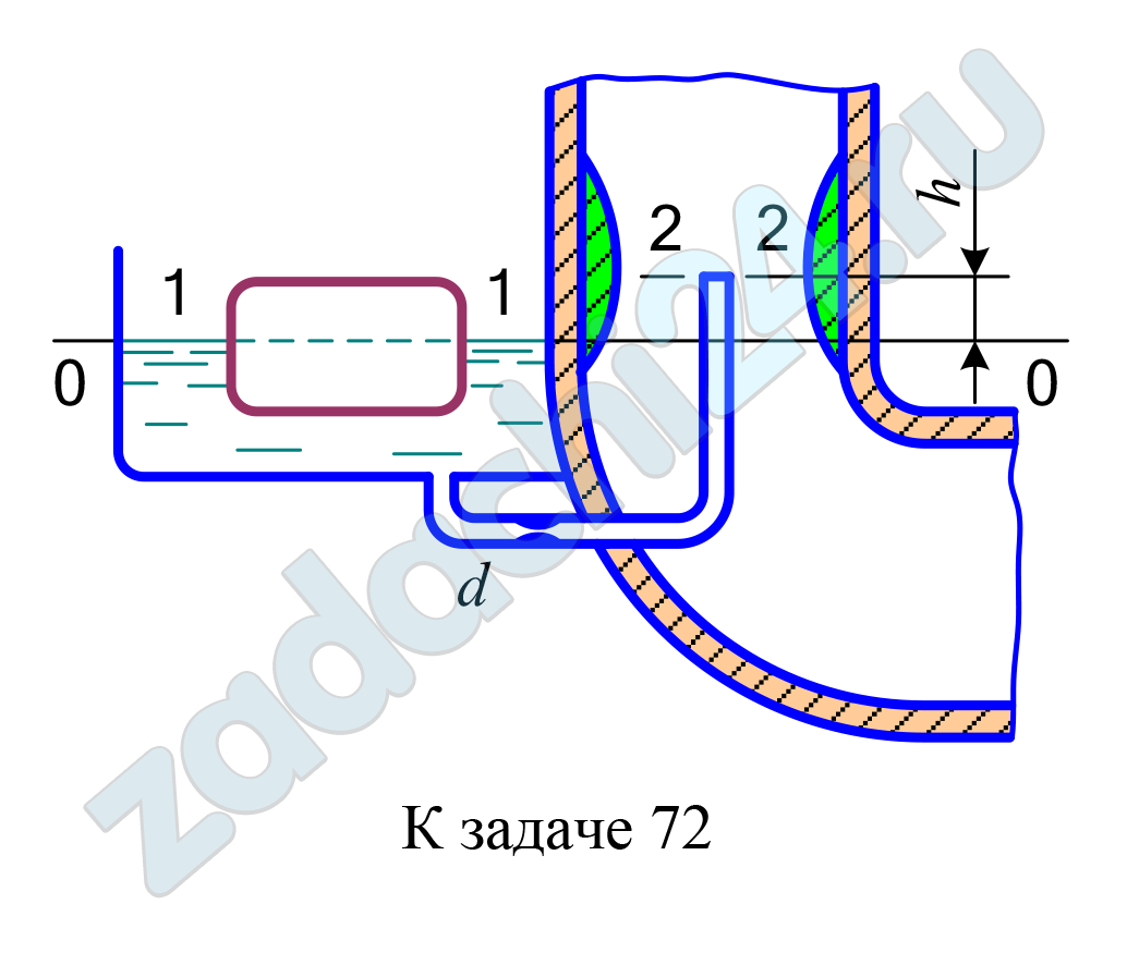8.227 Определить расход бензина (ρ =700 кг/м³) через жиклер карбюратора диаметром d, коэффициент расхода которого μ = 0,8. Бензин поступает к жиклеру из поплавковой камеры благодаря вакууму, который создается в диффузоре карбюратора. Выходное сечение бензотрубки расположено на h выше уровня бензина в поплавковой камере, вакуум в диффузоре рвак, давление в поплавковой камере – атмосферное. Потерями напора в бензотрубке пренебречь.