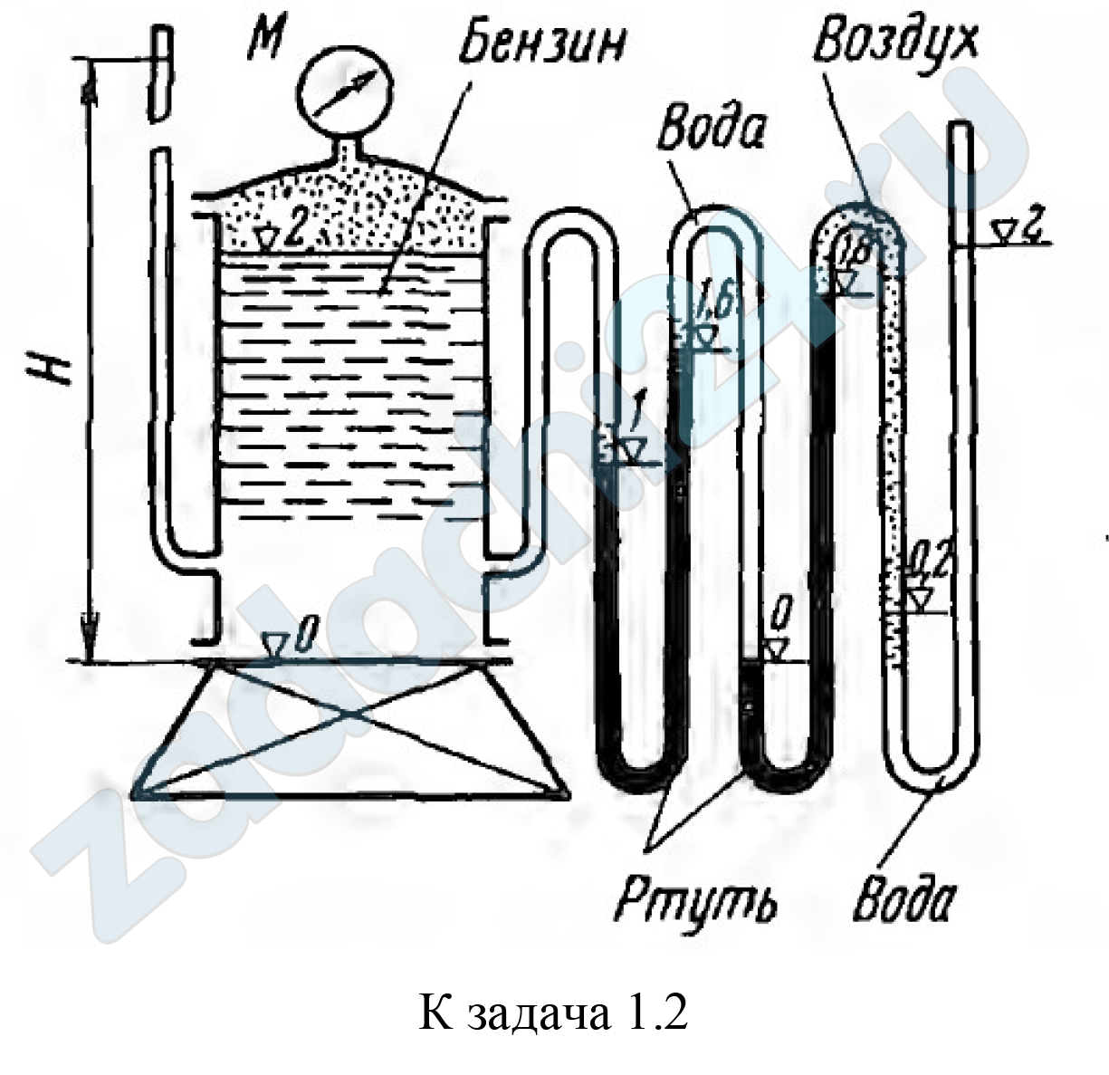 Определить показания М манометра и Н пьезометра, если уровни жидкостей в трехколенном манометре расположились так, как показано на рисунке (отметки уровней ∇ даны в метрах).