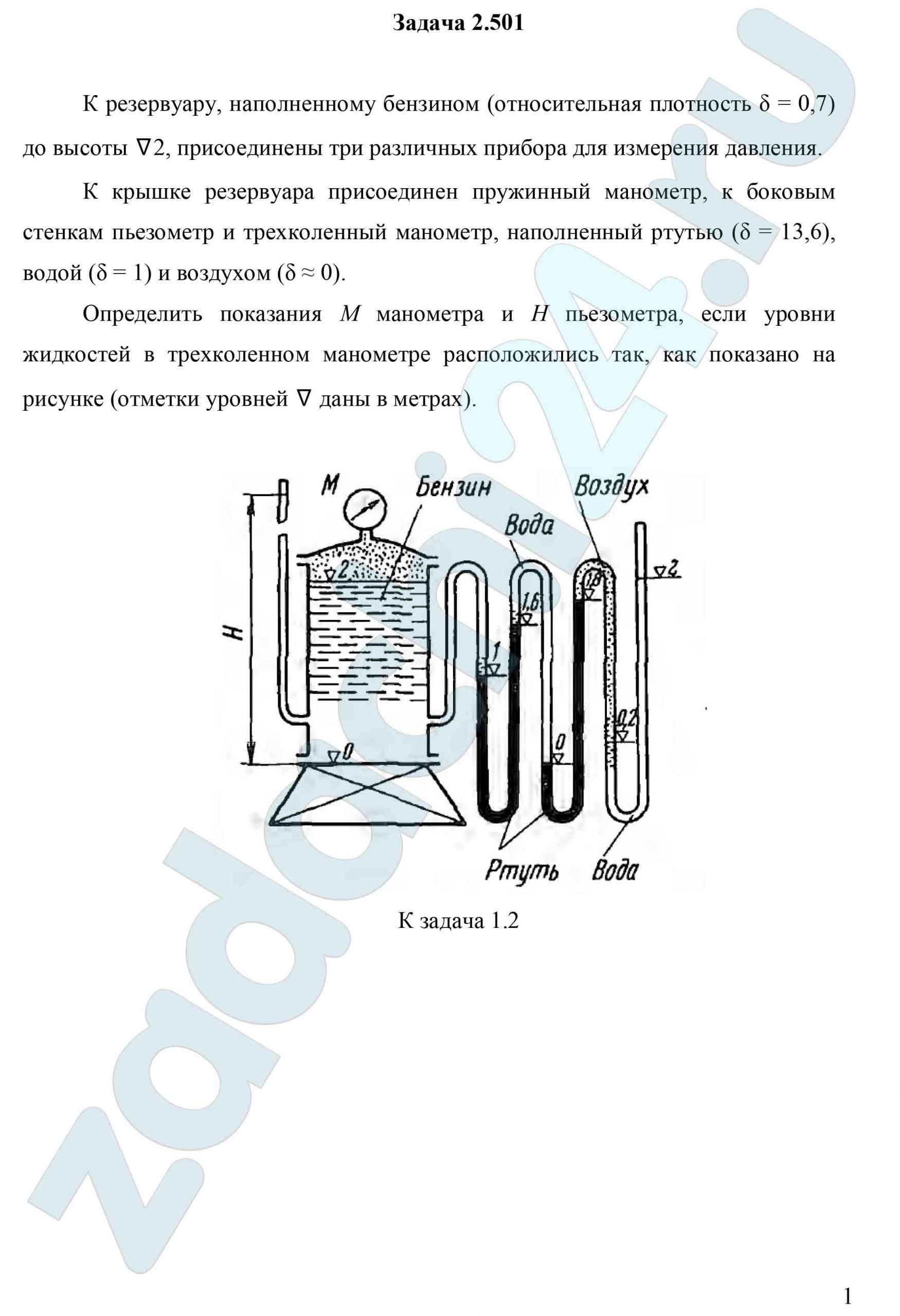 2.501 К резервуару, наполненному бензином (относительная плотность δ = 0,7) до высоты ∇2, присоединены три различных прибора для измерения давления.