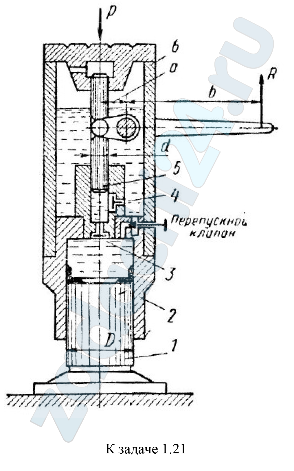 Определить рабочее усилие R на рукоятке приводного рычага насоса. необходимое для поднятия груза Р = 12 т, если диаметр поршня домкрата D = 200 мм, диаметр плунжера насоса d = 20 мм и плечи приводного рычага а = 60 мм и b = 700 мм.