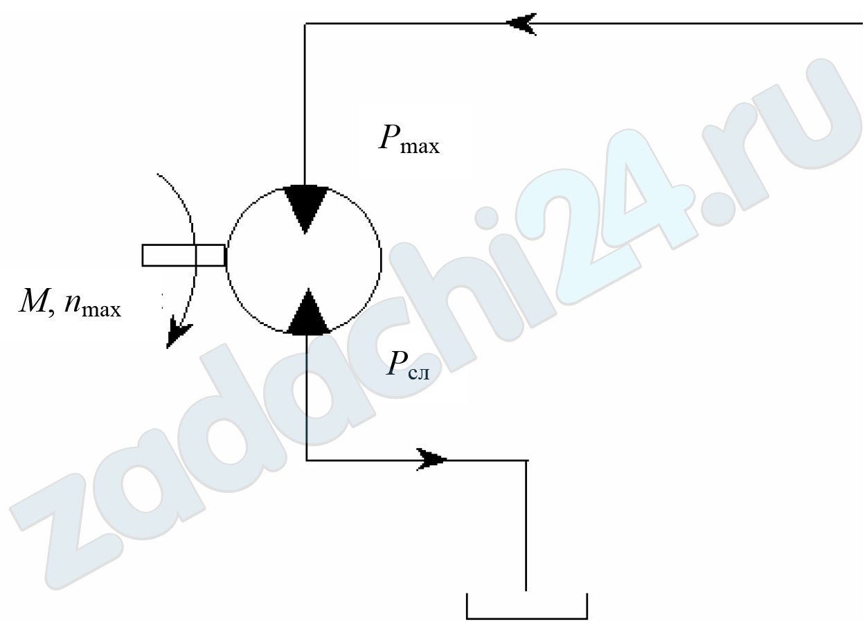 13.106 Определить максимальную частоту вращения nmax ротора гидромотора, нагруженного постоянным моментом M, если максимальное давление на входе pmax, расход жидкости Q, объёмный КПД гидромотора при pmax η0, механический КПД при том же давлении ηмех, давление на сливе рсл.