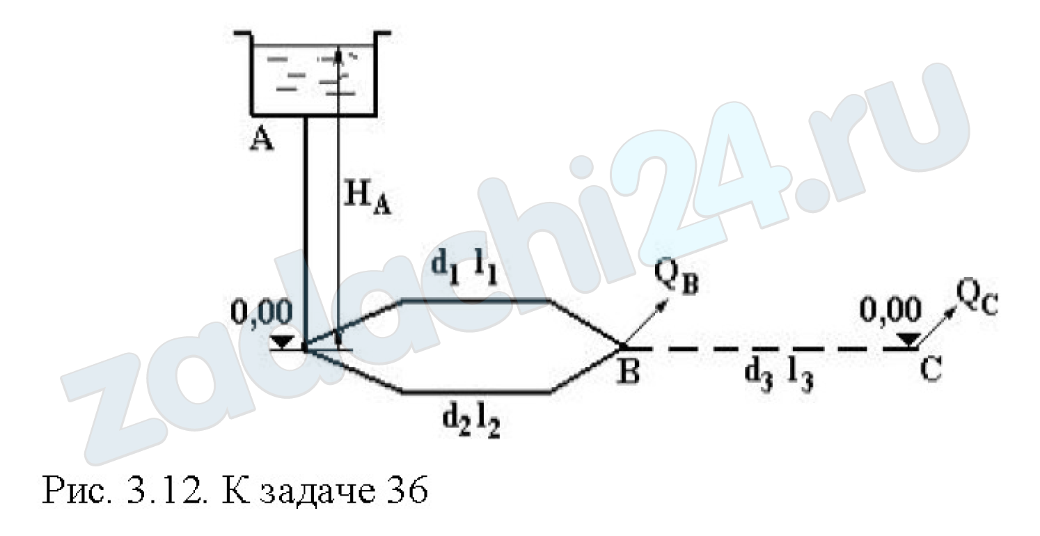 11.202 Расход QВ = 30 л/с поступает из напорного бака А в пункт В по двум параллельно соединенным трубопроводам (рис. 3.12). Размеры параллельно соединенных труб l1 = 412 м, d1 = 150 мм, l2 = 386 м, d2 = 125 мм. Параллельно соединенные трубы стальные нормальные. Определить: 1) отметку НА горизонта воды в напорном баке и расходы Q1 и Q2 по параллельным ветвям; расход QC который можно получить в конце добавочной ветви ВС (l3 = 280 м, d3 = 150 мм), если увеличить начальный напор HA на 1,0 м; при этом расход QВ не меняется. На ветви ВС труба стальная новая. При определении расхода QC учесть, что потери и расходы на параллельных участках увеличатся по сравнению со значениями, полученными в п.1.