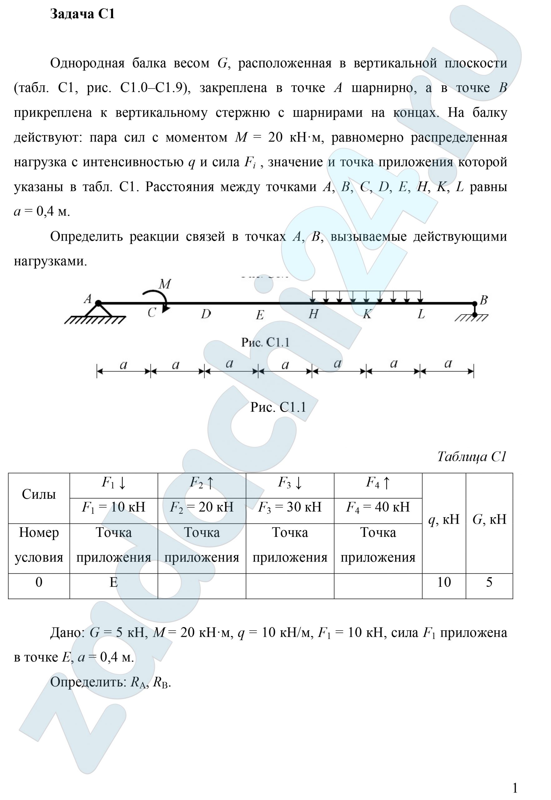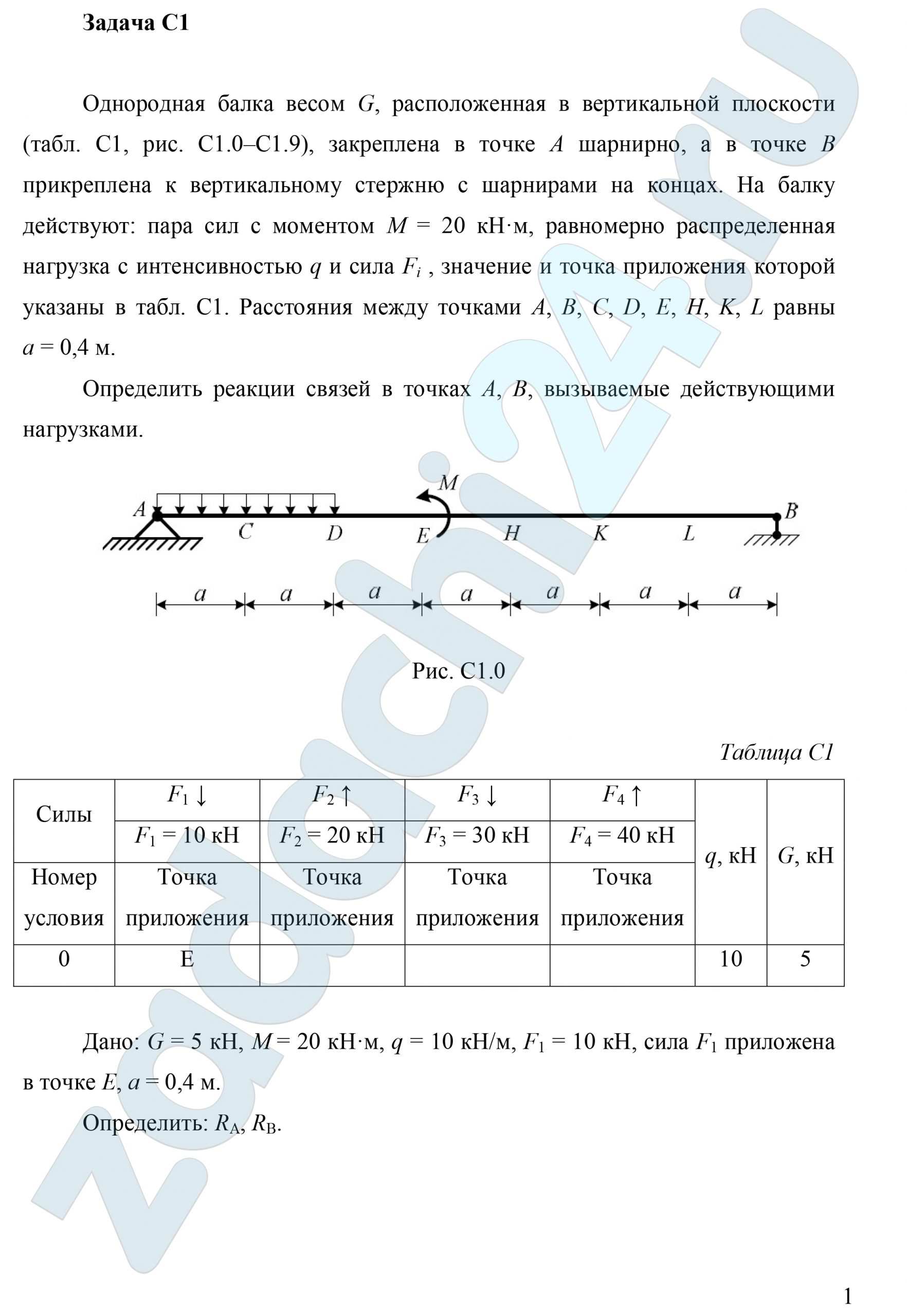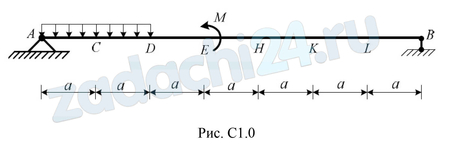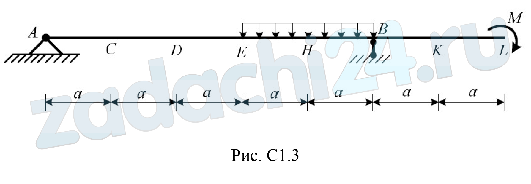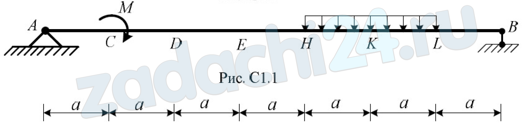 2.76 Однородная балка весом G, расположенная в вертикальной плоскости (табл. С1, рис. С1.0–С1.9), закреплена в точке А шарнирно, а в точке В прикреплена к вертикальному стержню с шарнирами на концах. На балку действуют: пара сил с моментом М = 20 кН·м, равномерно распределенная нагрузка с интенсивностью q и сила Fi , значение и точка приложения которой указаны в табл. C1. Расстояния между точками A, B, C, D, E, H, K, L равны a = 0,4 м.