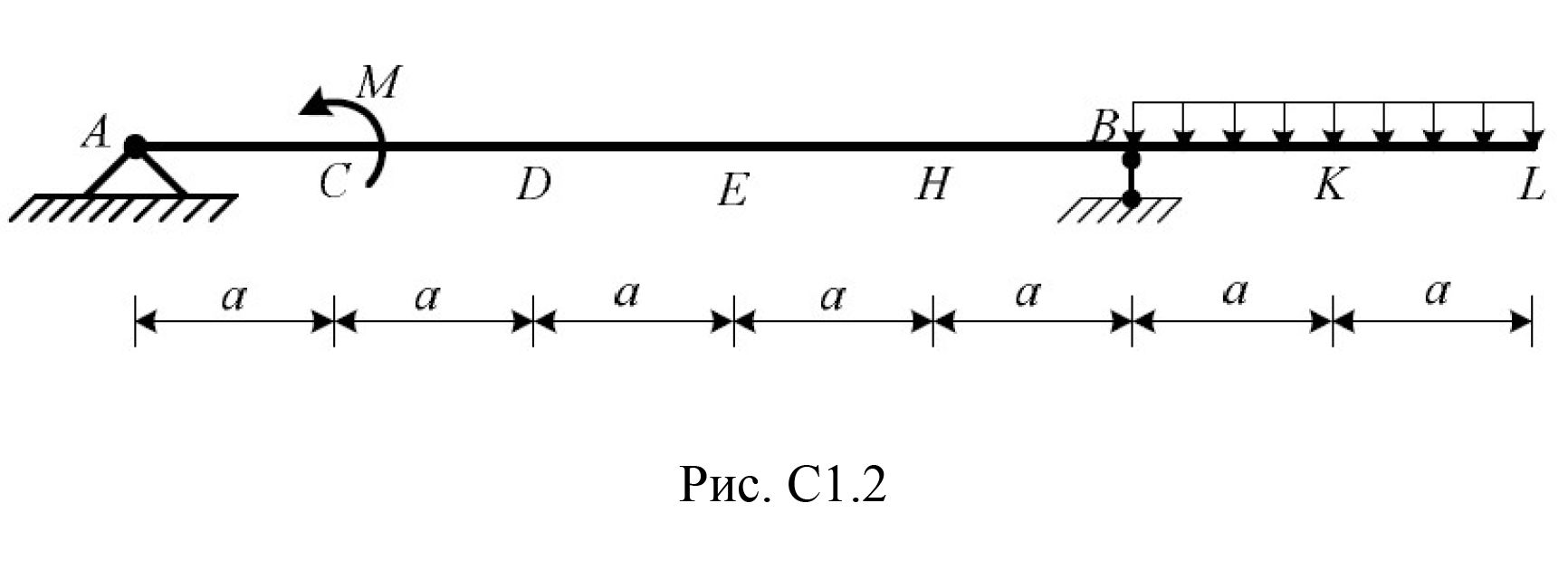2.77 Однородная балка весом G, расположенная в вертикальной плоскости (табл. С1, рис. С1.0–С1.9), закреплена в точке А шарнирно, а в точке В прикреплена к вертикальному стержню с шарнирами на концах. На балку действуют: пара сил с моментом М = 20 кН·м, равномерно распределенная нагрузка с интенсивностью q и сила Fi , значение и точка приложения которой указаны в табл. C1. Расстояния между точками A, B, C, D, E, H, K, L равны a = 0,4 м.