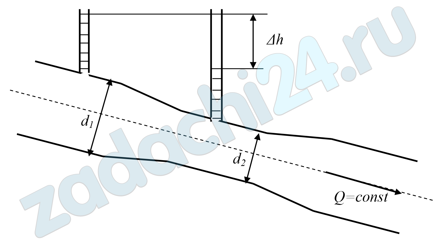 ![Яблонев А.Л. Задачи по гидрогазодинамике ТвГТУ Тверь 2020 Задача 4 В трубопровод диаметром d1 вмонтирован расходомер Вентури – струйный расходомер, состоящий из плавно сужающегося участка (конфузора), соединенного цилиндрической вставкой диаметром d2 с постепенно расширяющимся участком (диффузором). К расходомеру подключены два пьезометра: один – перед конфузором, другой – посередине вставки. Разность показаний пьезометров составляет Δh. Определить расход воды Q [л/мин], протекающей по трубопроводу, пренебрегая потерями напора из-за незначительной длины прибора и плавно изменяющихся диаметров живого сечения между точками подключения пьезометров. Принять коэффициенты Кориолиса равными 1.](https://zadachi24.ru/wp-content/uploads/2024/11/gidro_7.340.1-1024x592.png)