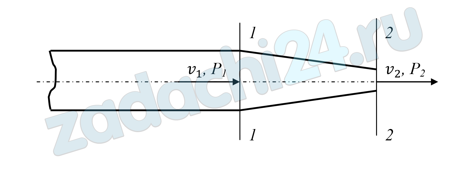 7.341 Определить, какое избыточное давление р1 необходимо создать в сечении 1–1 трубопровода перед горизонтально расположенным соплом гидромонитора, чтобы обеспечить в его выходном сечении 2–2 среднюю скорость υ2, если в сечении 1–1 (в месте излива воды в атмосферу) средняя скорость υ1. Потерями напора пренебречь из-за незначительной длины сопла гидромонитора. Принять коэффициенты Кориолиса равными 1.